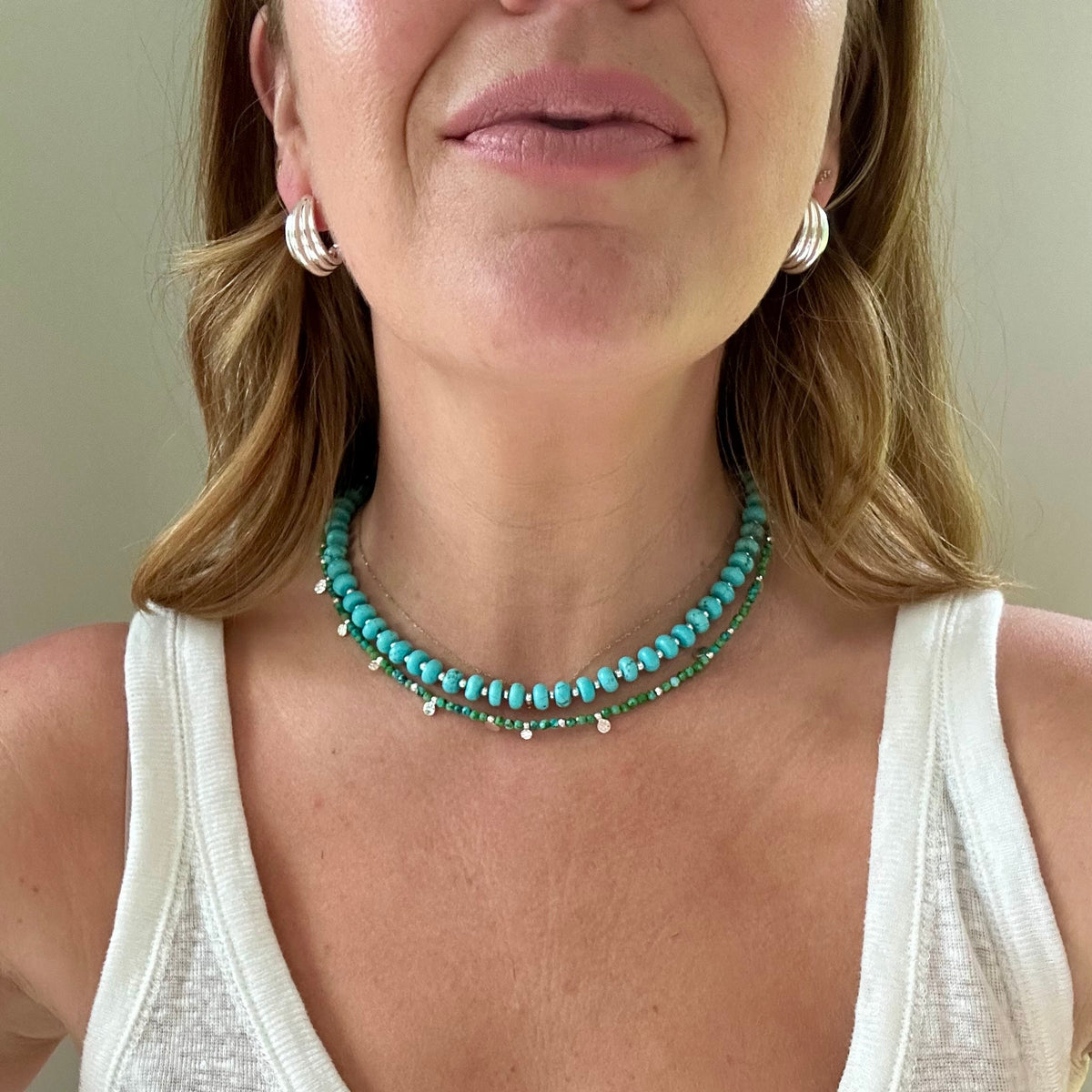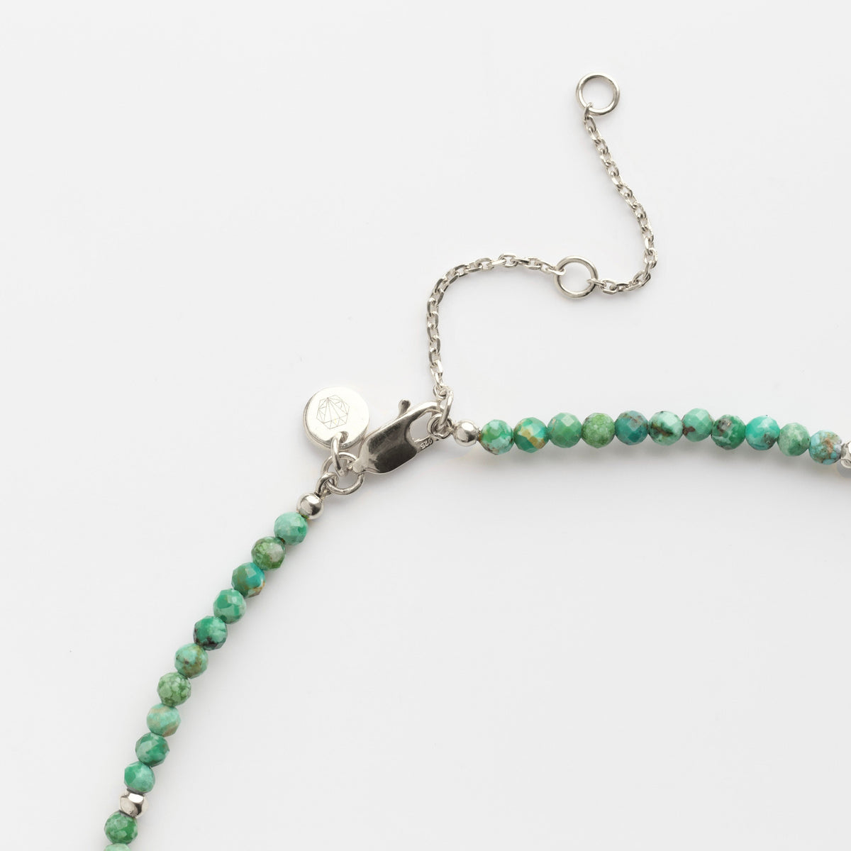 This Turquoise Coin Necklace by Carrie Elizabeth in Sterling Silver combines the timeless allure of turquoise with the sleek finish of silver. Its vivid beads and molten coin details add movement and shine to any outfit. This necklace brings health, good fortune, and protection, perfect for everyday wear or layering.