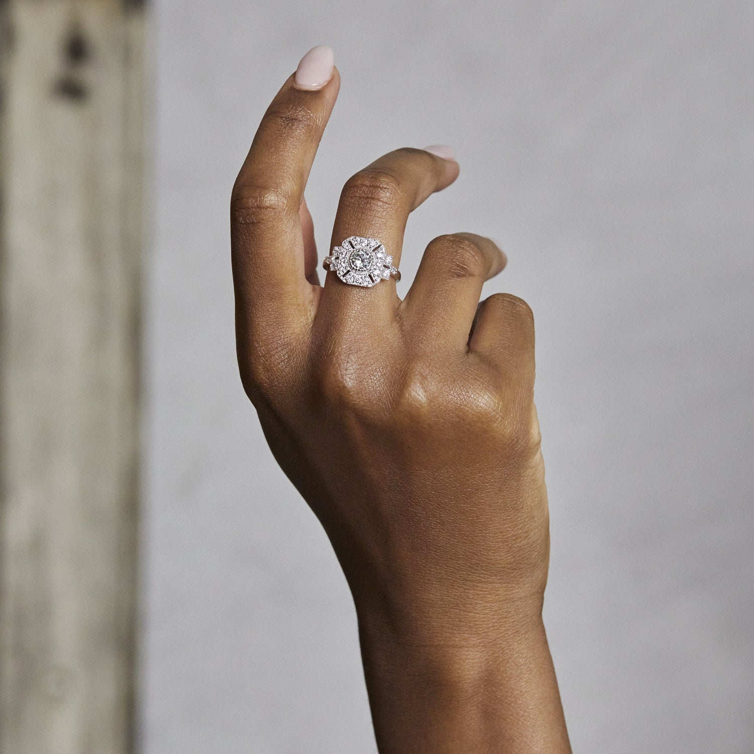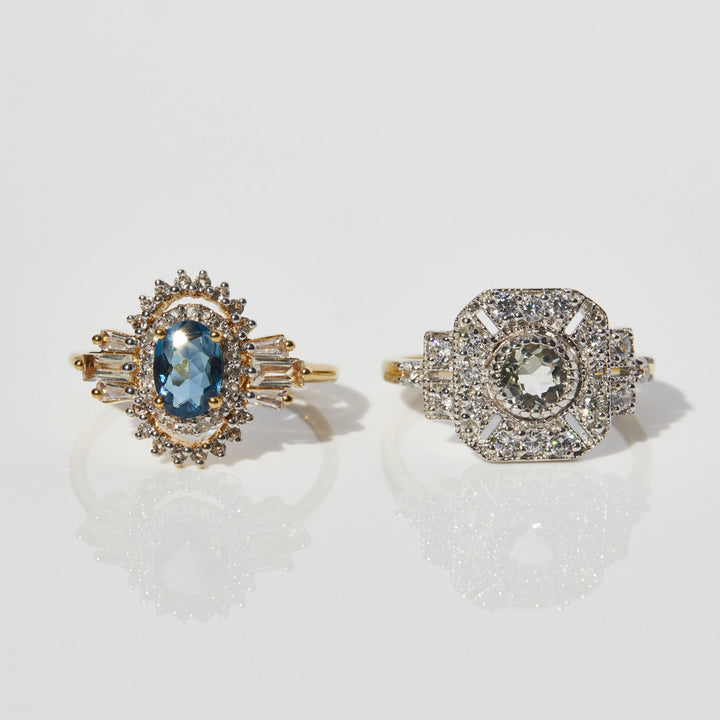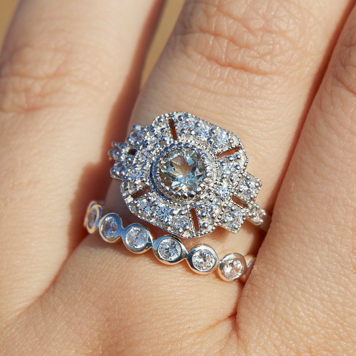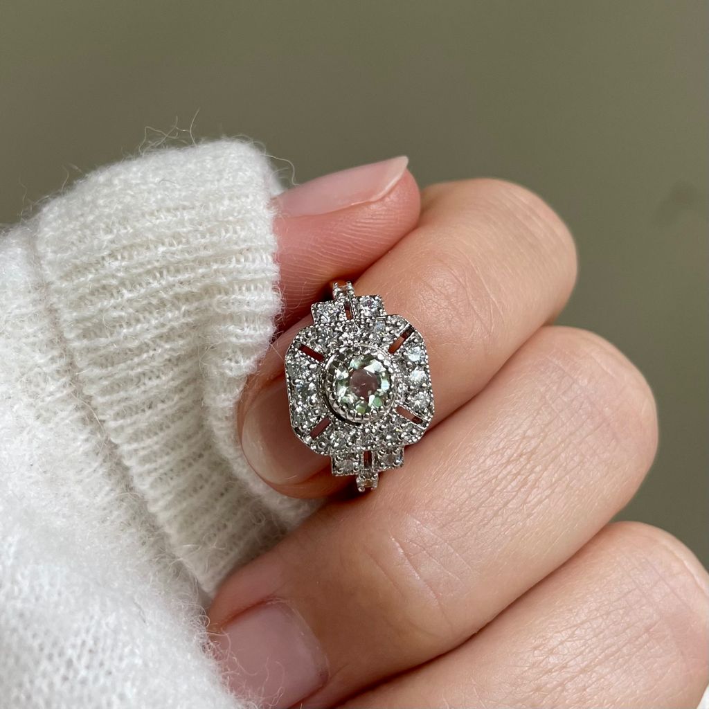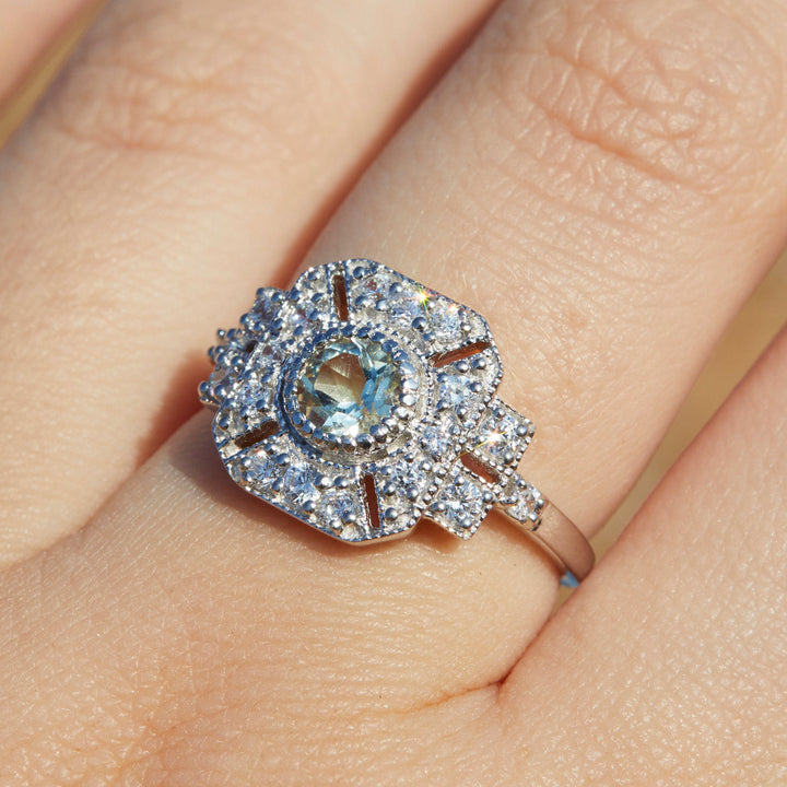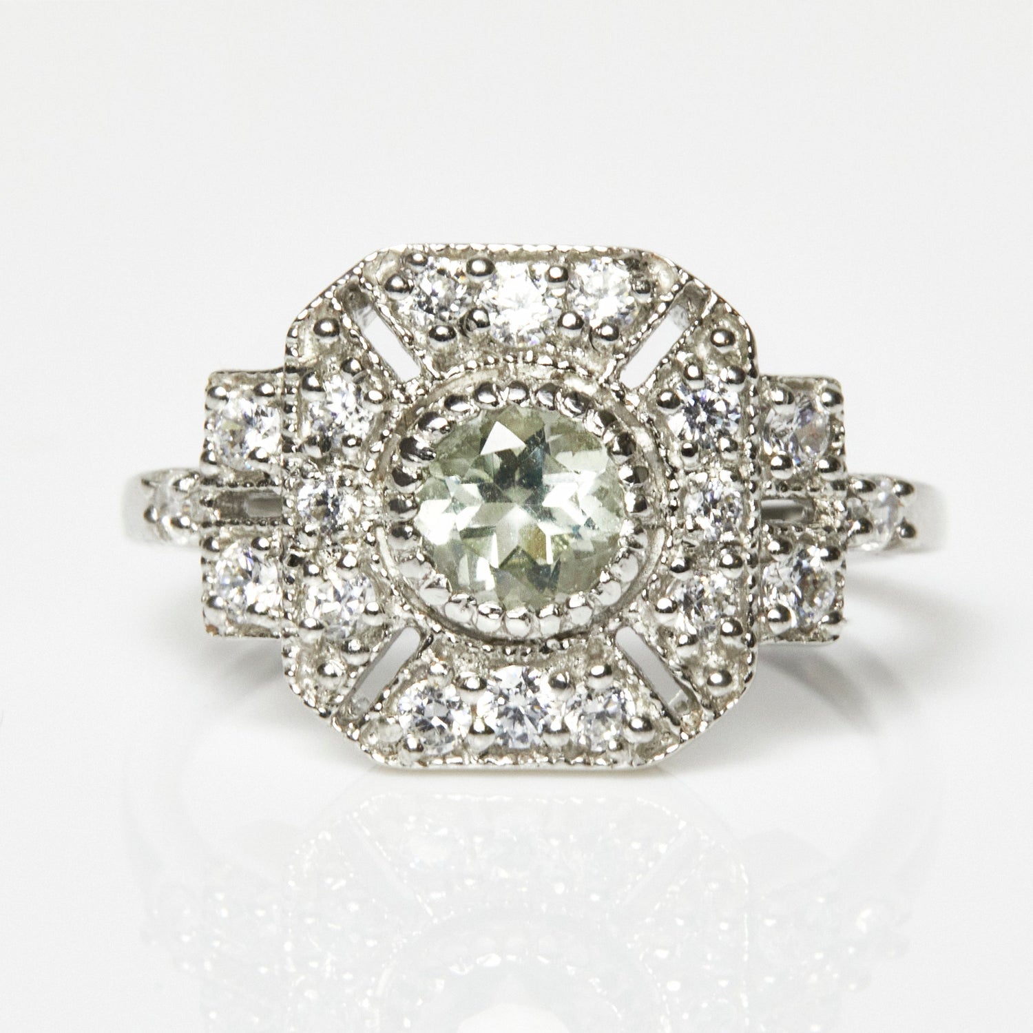 This Venus Green Amethyst Ring by Carrie Elizabeth in Sterling Silver is a statement piece with old-school elegance. A subtle green amethyst center is surrounded by a halo of sparkling cubic zirconia stones, making it a must-have for adding vintage-inspired glamour to your everyday look.