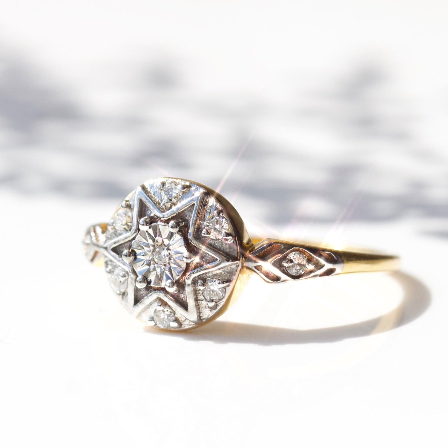 This Vintage Star Compass Ring by Carrie Elizabeth in 14k Gold Vermeil is a celestial-inspired masterpiece. The intricate compass design sparkles with star-set diamond details, symbolizing guidance and purity. Perfect as a meaningful statement piece to navigate life’s journeys.