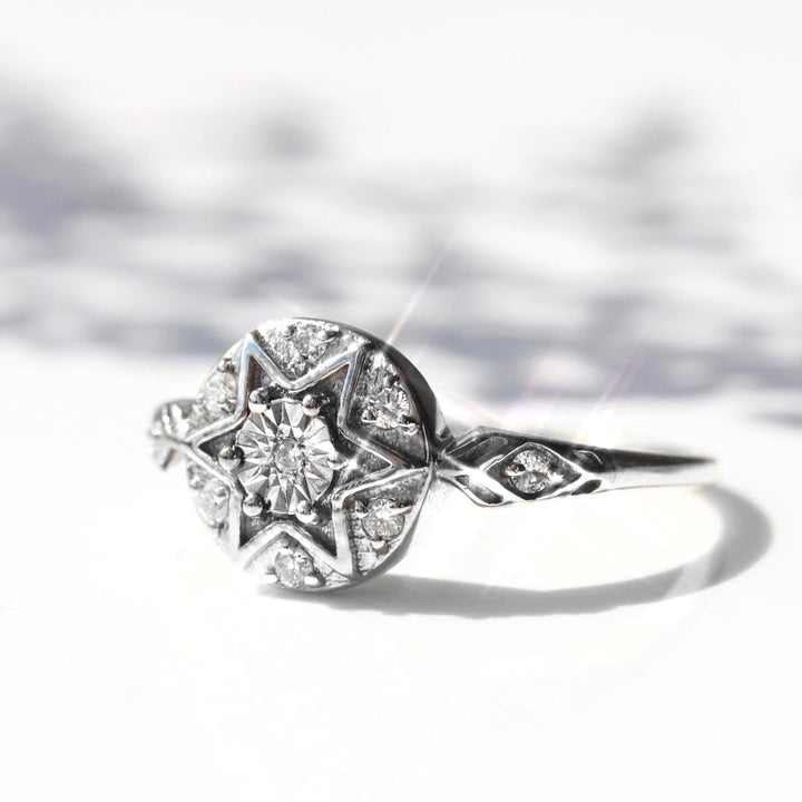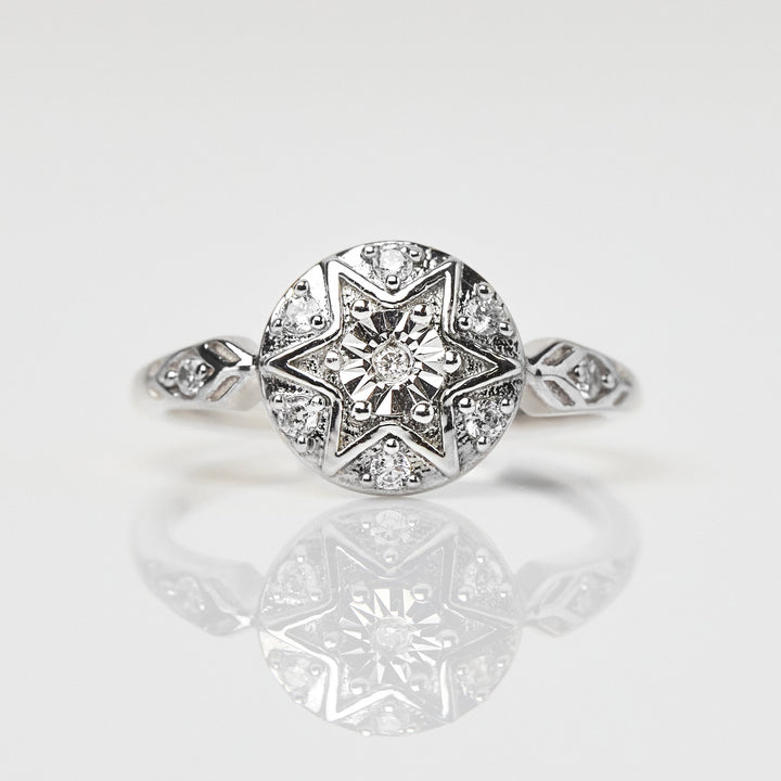 This Vintage Star Compass Ring by Carrie Elizabeth in Sterling Silver offers timeless sparkle with a celestial-inspired compass design. Featuring star-set diamond accents, it’s a meaningful piece for those who seek guidance and light in their journey through life.