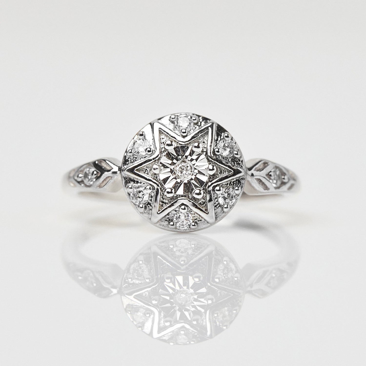 Crafted in Sterling Silver, featuring diamond accents in a star compass design. Dimensions and ring size details available upon request.