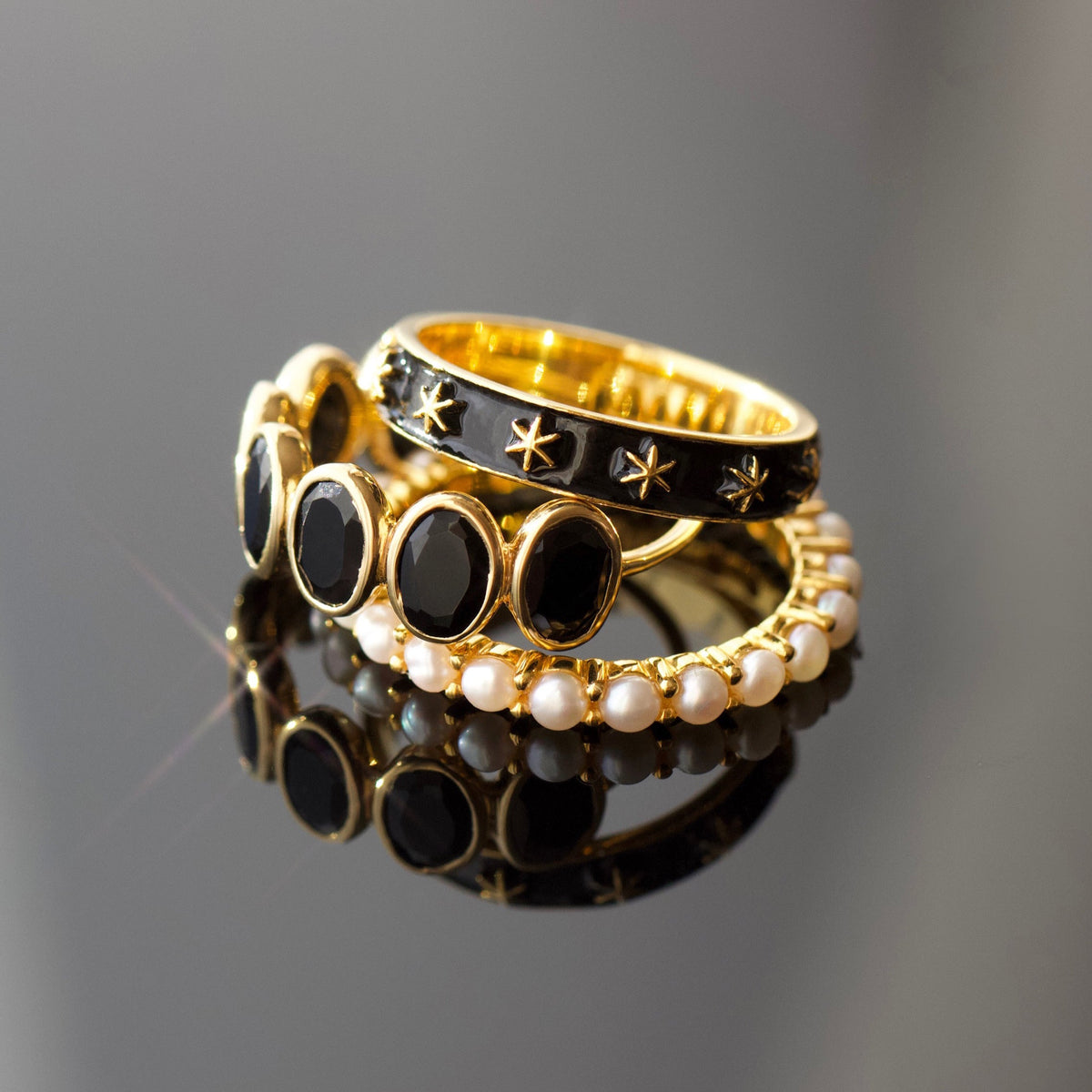 Crafted in 14k Gold Vermeil, featuring oval-cut bezel-set black onyx stones. Dimensions and ring size details available upon request.