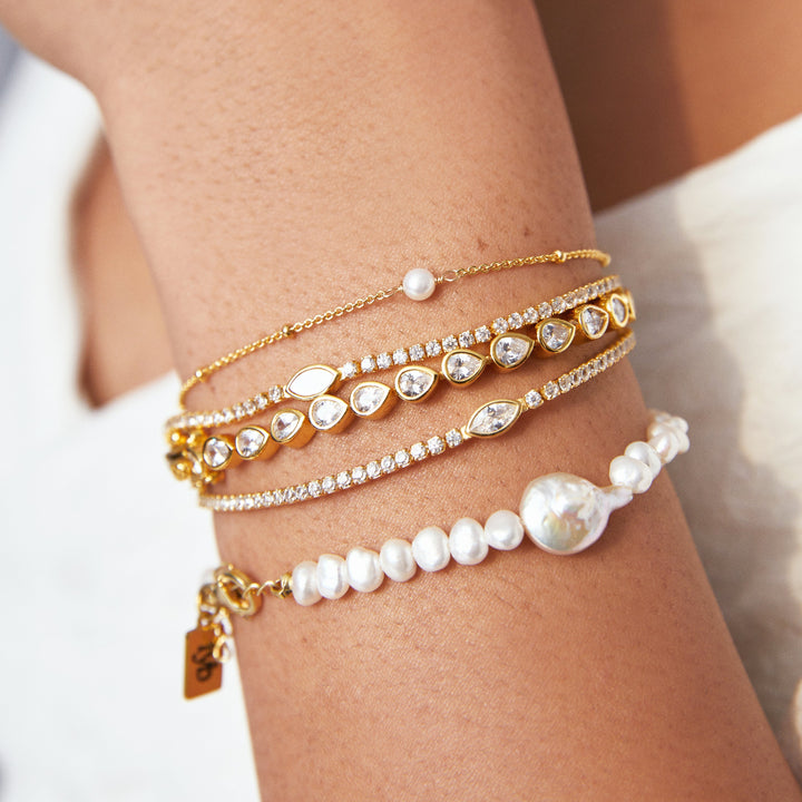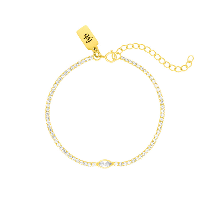 This Arya Tennis Bracelet Crystal Gold by fyb is a delicate take on a statement classic. With a central 2mm stone and sparkling CZ along the band, it offers understated glamour and a refined silhouette.