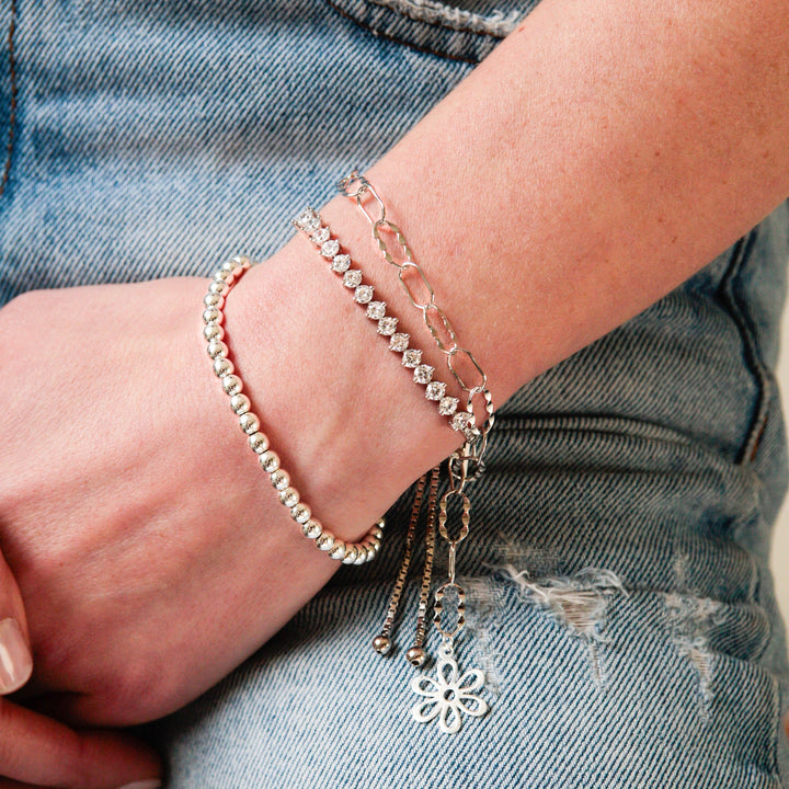 This Silver Staple Bracelet by fyb is a minimalist essential you’ll never want to take off. Featuring a string of 4mm round hematite beads, its clean silver silhouette adds a cool, grounding energy to your daily stack. Handmade with love in NYC, this versatile bracelet is a style staple meant for everyday ease and intentional layering.