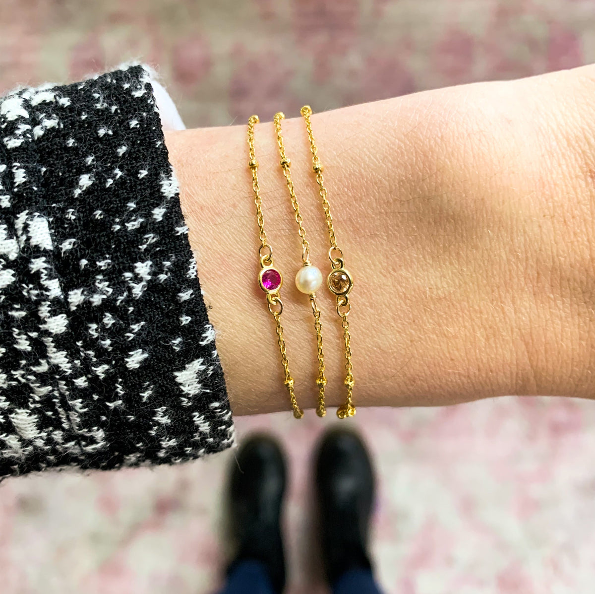 This July Birthstone Bracelet by fyb in gold features a fiery CZ inspired by ruby—a symbol of passion and vitality. Elegant and meaningful, it’s perfect as a gift or personal talisman.