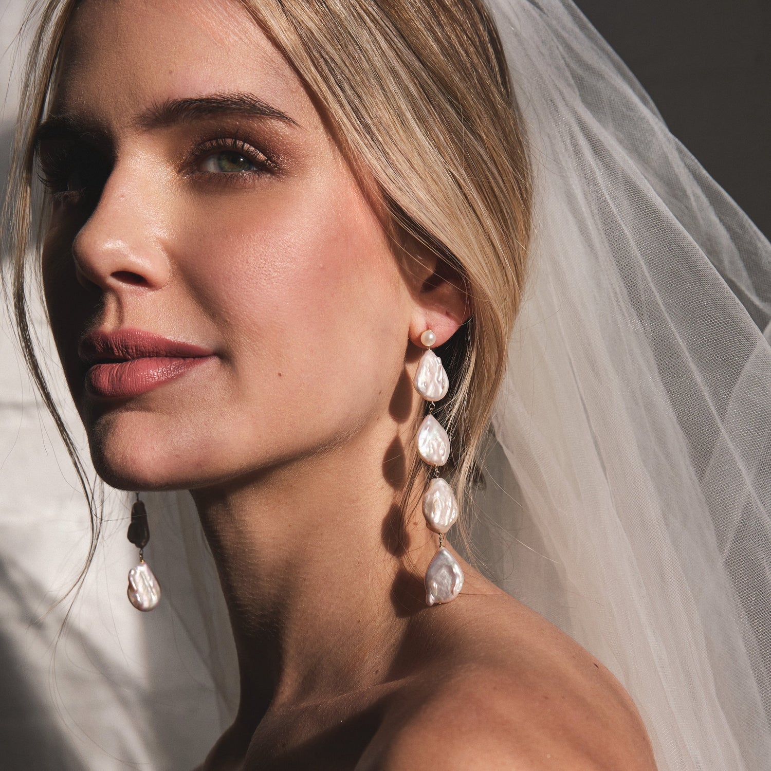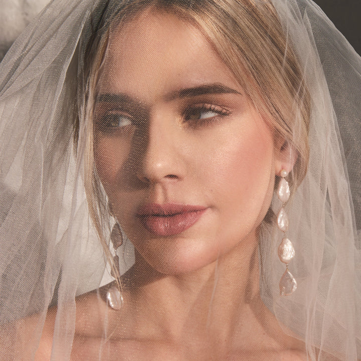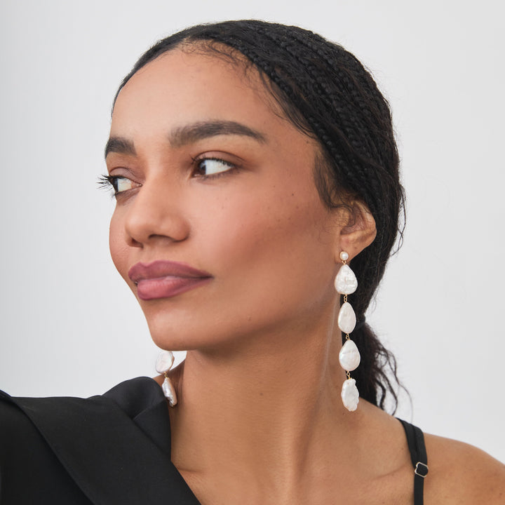 These Elowen Pearl Earrings by FYB are the epitome of elegance and drama. Featuring elongated strands of luminous freshwater pearls suspended from gold-plated studs, they offer a graceful 3.75' drop that sways with every step. Ideal for formal events or a standout evening look.