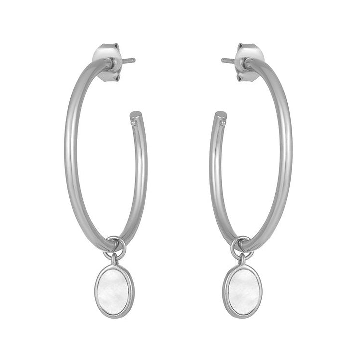 These Catalina Hoops by fyb offer a contemporary twist on a timeless silhouette. Crafted in luminous sterling silver and inlaid with Mother of Pearl, they bring ethereal light and a sense of serenity to any look. The generous 30mm size makes them perfect for a bold yet sophisticated statement.