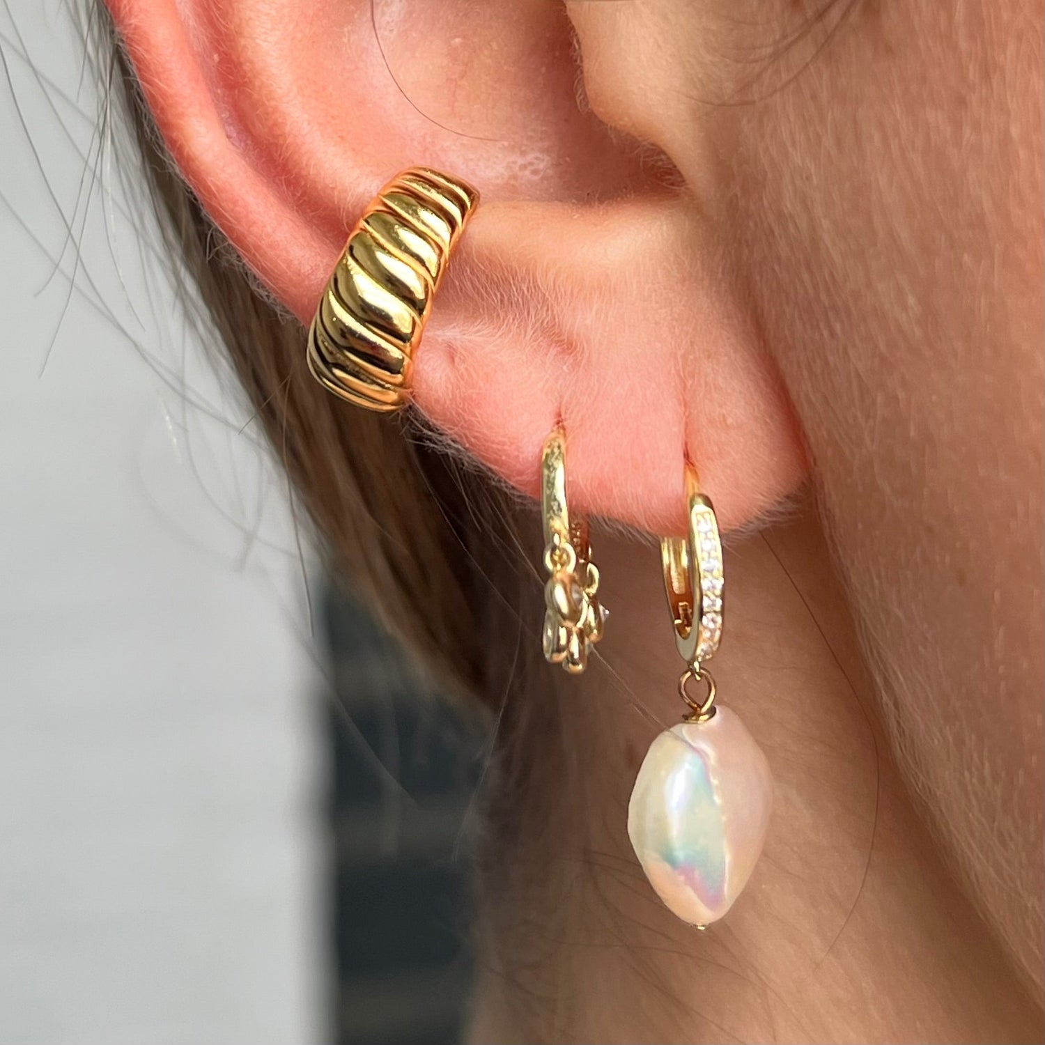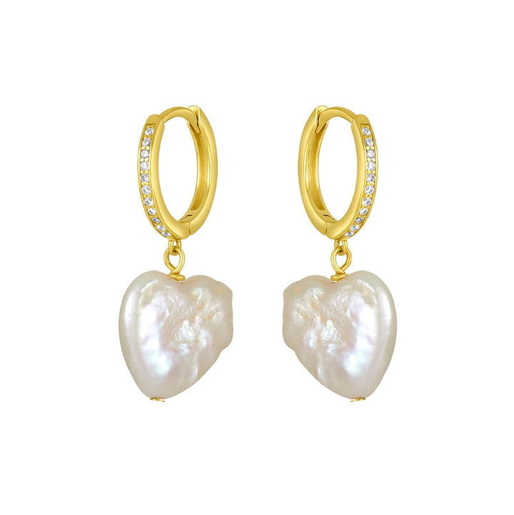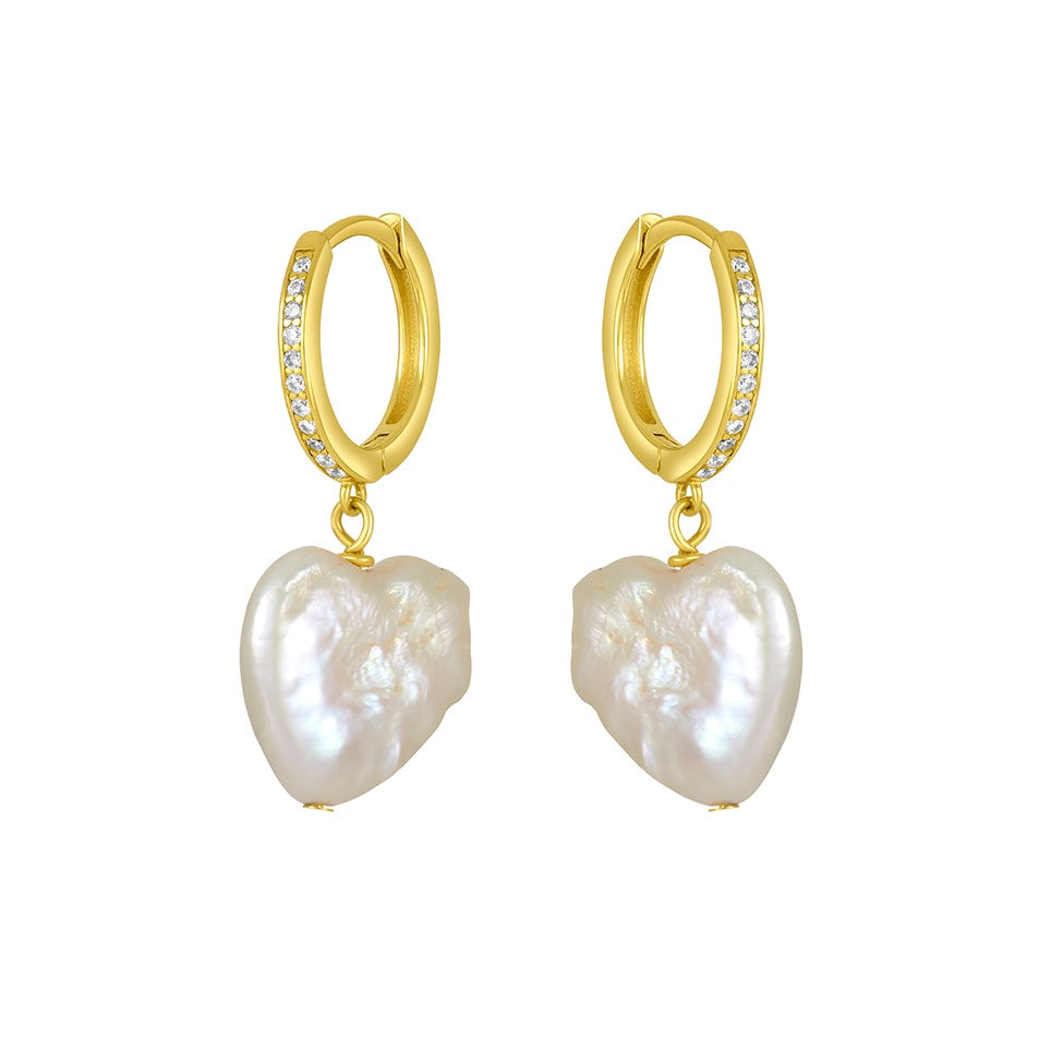 These Noa Huggies by fyb are full of playful elegance. A heart-shaped freshwater pearl charm adds romantic whimsy to the classic gold huggie base, accented by shimmering CZ stones. A sweet, standout detail perfect for everyday love.