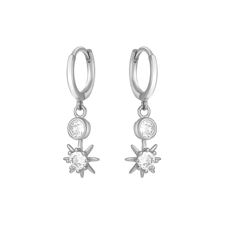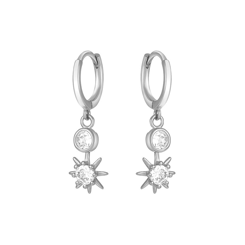 These Sunray Huggies by fyb glow with celestial charm. A radiant sunray charm dangles from a sleek silver huggie, making them a delicate yet eye-catching piece. Wear solo for a soft statement or stack for an artful ear moment.
