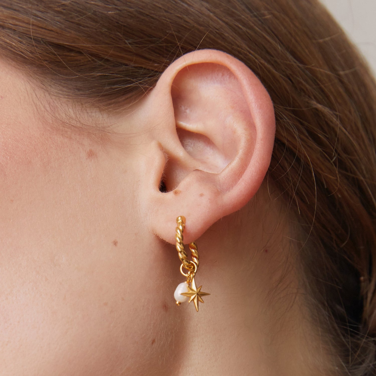 These Rumi Charm Huggies in Gold by fyb mix texture and playfulness. Twisted gold huggies are adorned with a dangling starburst and pearl charm—perfect for styling with intention and flair.