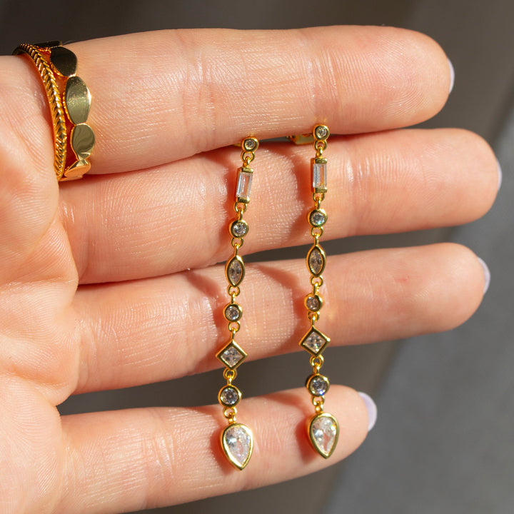 These Elena Duster Earrings by FYB make a dazzling statement with their sleek, linear silhouette. Sparkling bezel-set cubic zirconia stones are arranged along 50mm-long drops, creating elegant movement and brilliance. Lightweight and hypoallergenic, these dusters are perfect for special occasions or turning heads with everyday glam.