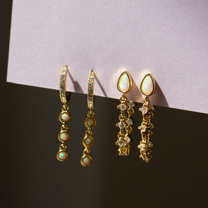 These Sophia Opal Huggies by fyb combine classic pavé sparkle with playful movement, thanks to their delicate dangling opal chains. Ideal for stacking or a solo statement, they bring a dreamy elegance to any ear party.