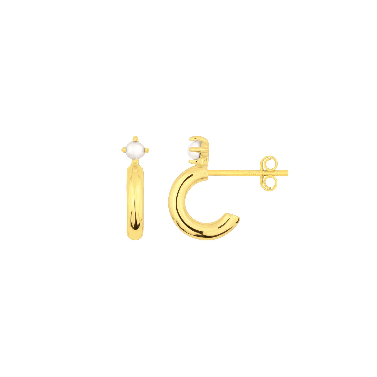 18k gold plated 925 sterling silver, pearl, 10mm diameter. Hypoallergenic and nickel-free.