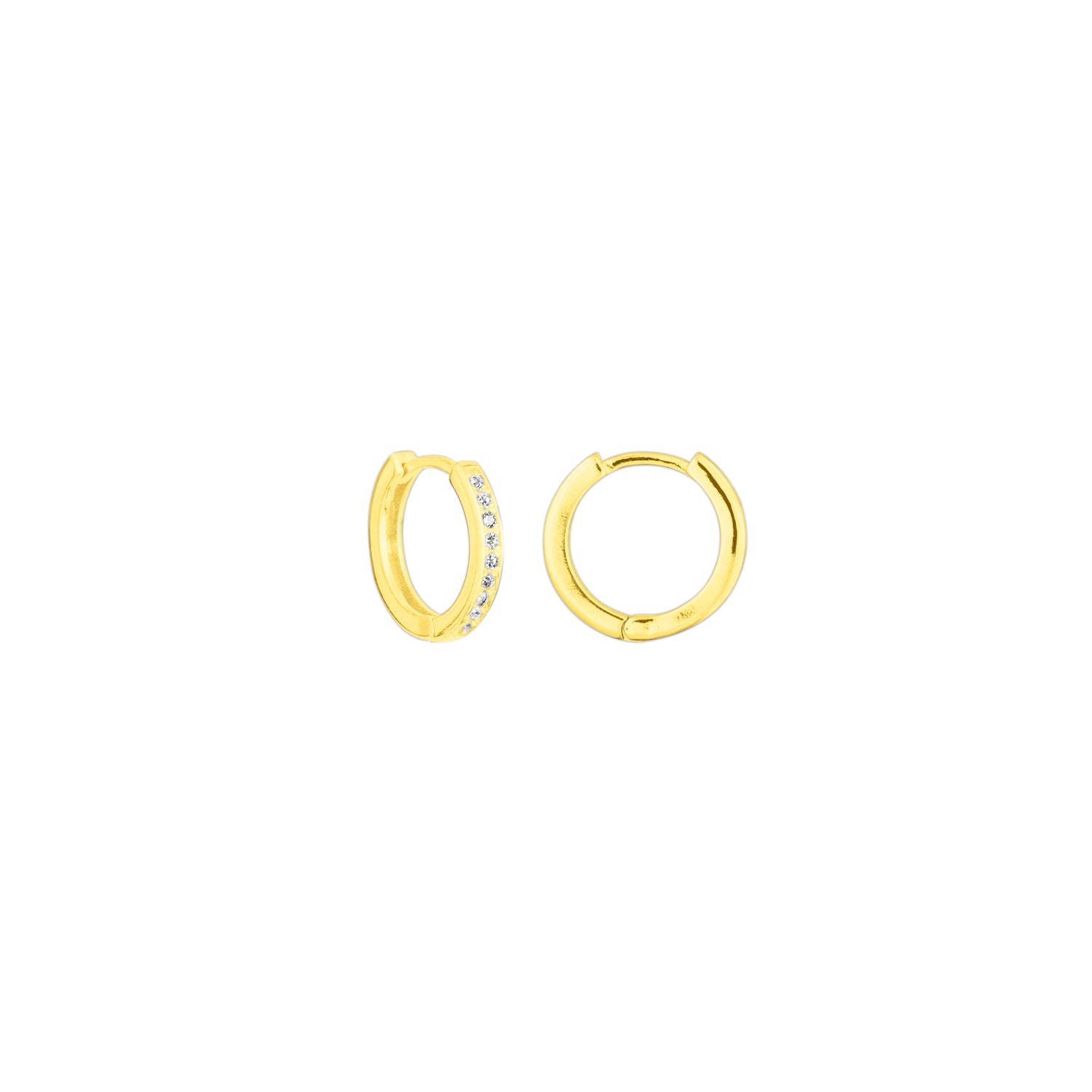 Mini huggies made from 18k gold-plated sterling silver with CZ stones, ⅓' diameter. Nickel-free.