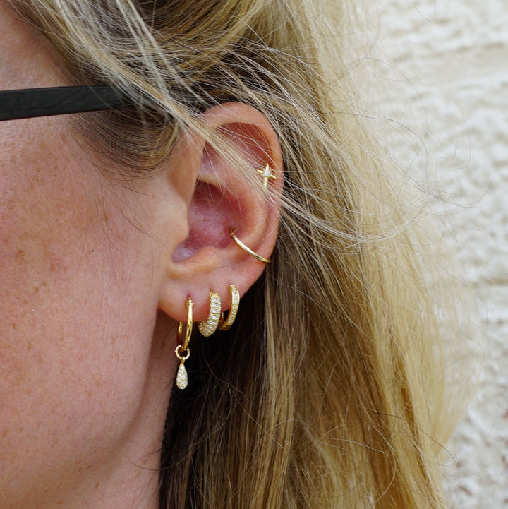 These Kaia Hoop Earrings by FYB are the definition of understated charm. Delicate cubic zirconia charms dangle from petite 18k gold-plated hoops, adding a hint of sparkle to your everyday look. Light and versatile, these hoops are perfect for stacking or wearing alone.