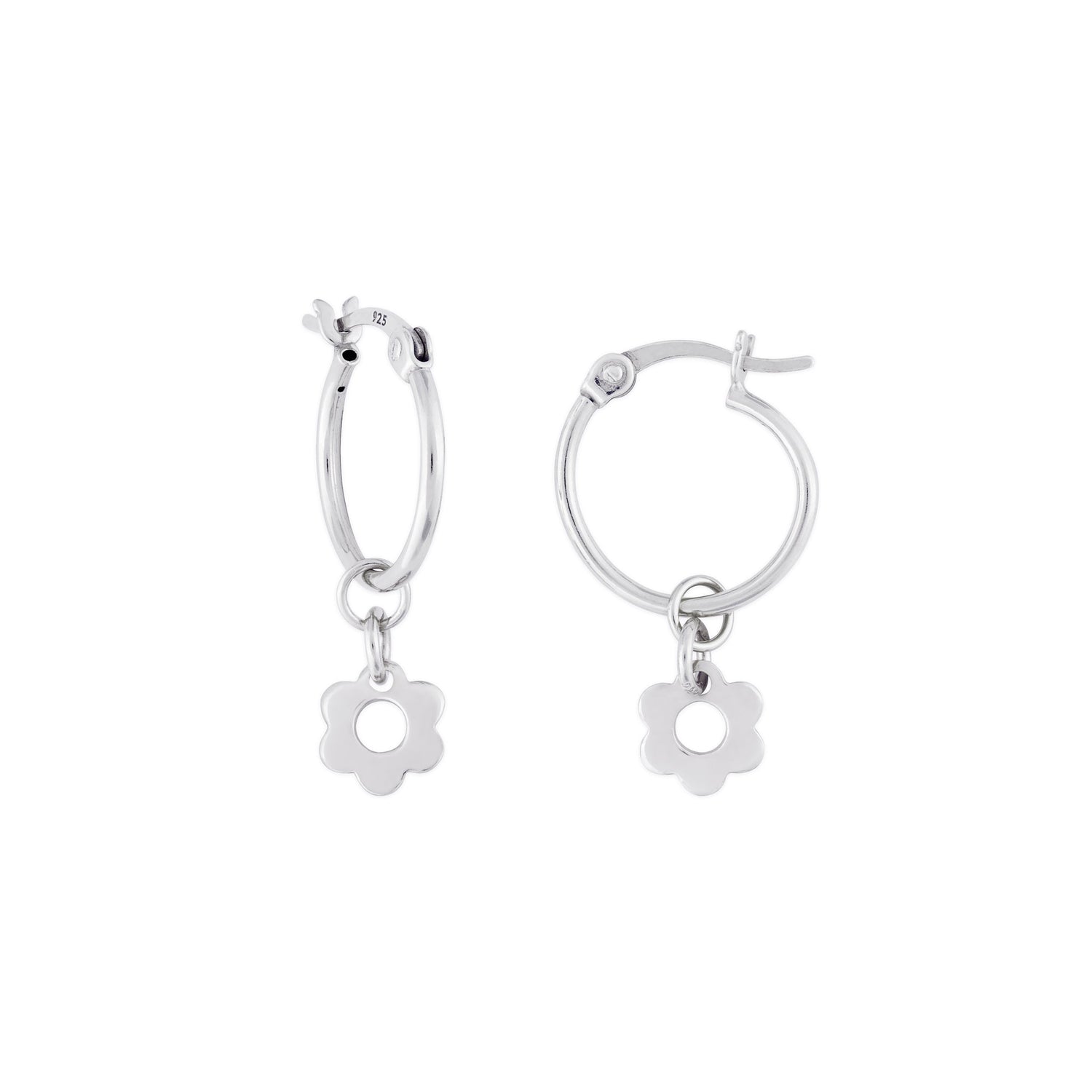 These Kaia Hoop Earrings by FYB take a botanical turn with their dangling flower charms. A fresh and whimsical update to classic silver hoops, they bring charm and playfulness to your everyday look.