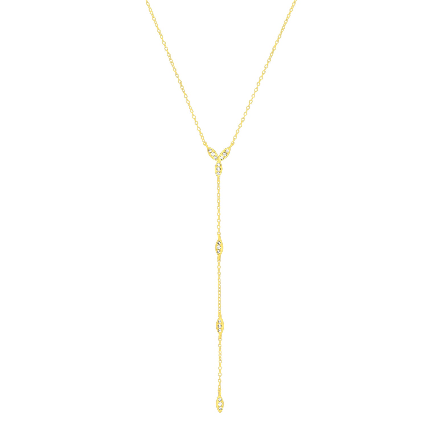 This Chiara Lariat Necklace by fyb adds refined sparkle with scattered cubic zirconia along a delicate gold chain. Elegant worn solo or layered with shorter pieces, this necklace elevates everyday sophistication.
