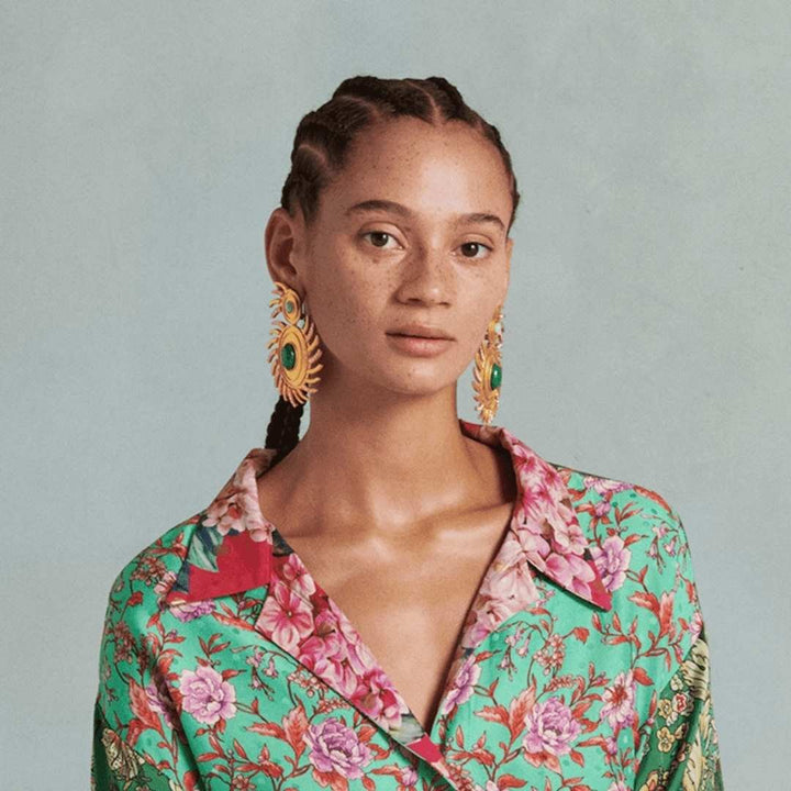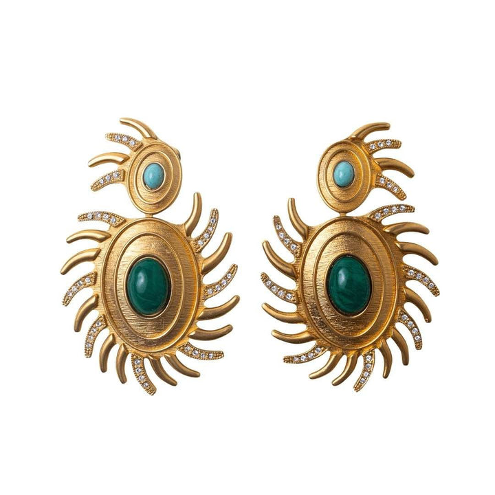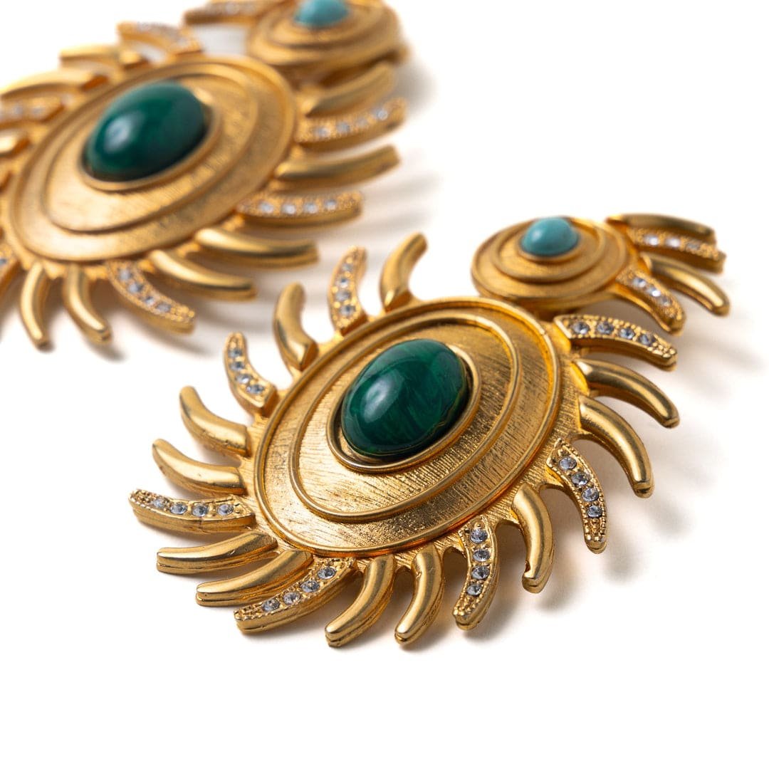Entrusted with iconic designer Sonia Petroff's archive upon her passing, Maria Leoni-Sceti felt compelled to revive the vibrant and opulent pieces. Sonia's legacy, rooted in confidence and rebellion, finds new life through Maria's modern touch. The jewelry embodies a confident, feminine style, updated with a contemporary edge while retaining the vibrancy and joy of earlier times. Handmade in Tuscany, the brand prioritizes ethical production and sustainability. Style notes: Exude statement glamour with our custom double sun earrings, featuring a bold drop design inspired by the warmth and omnipresence of the sun. Simulated malachite oval cabochons become the main focal point encased by sun rays embellished with Swarovski crystals. A textured finish on the carefully coated 24k gold overlay offers a vintage touch. Clip-backs keep these handcrafted earrings secure.Price: Please note price may vary due to exchange rate differences or shipping, duties and taxes. Price may also vary with materials choice. Final price is calculated at checkout at the designer's website. Materials: 24k gold overlay with Swarovski crystals and simulated cabochon.