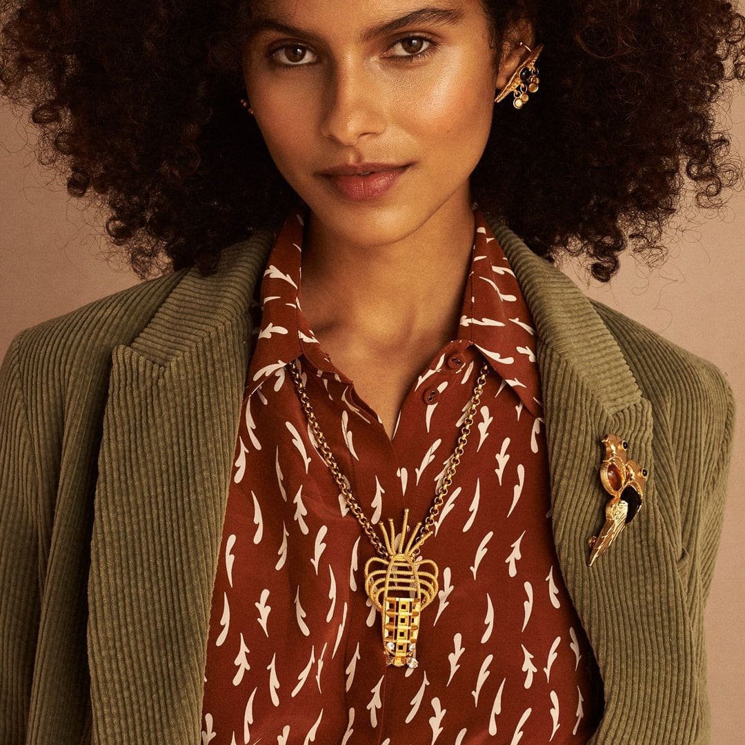Entrusted with iconic designer Sonia Petroff's archive upon her passing, Maria Leoni-Sceti felt compelled to revive the vibrant and opulent pieces. Sonia's legacy, rooted in confidence and rebellion, finds new life through Maria's modern touch. The jewelry embodies a confident, feminine style, updated with a contemporary edge while retaining the vibrancy and joy of earlier times. Handmade in Tuscany, the brand prioritizes ethical production and sustainability. Style notes: This statement necklace features our much-loved lobster, which is the symbol of Sonia Petroff. The large, solid belcher chain is full of vintage charm while the large lobster is ideal for fun, free-spirited women. The handcrafted textured gold overlay is adorned with Swarovski crystals and lends the piece an irrepressible sense of fun.Price: Please note price may vary due to exchange rate differences or shipping, duties and taxes. Price may also vary with materials choice. Final price is calculated at checkout at the designer's website. Materials: 24k gold overlay with Swarovski crystals.