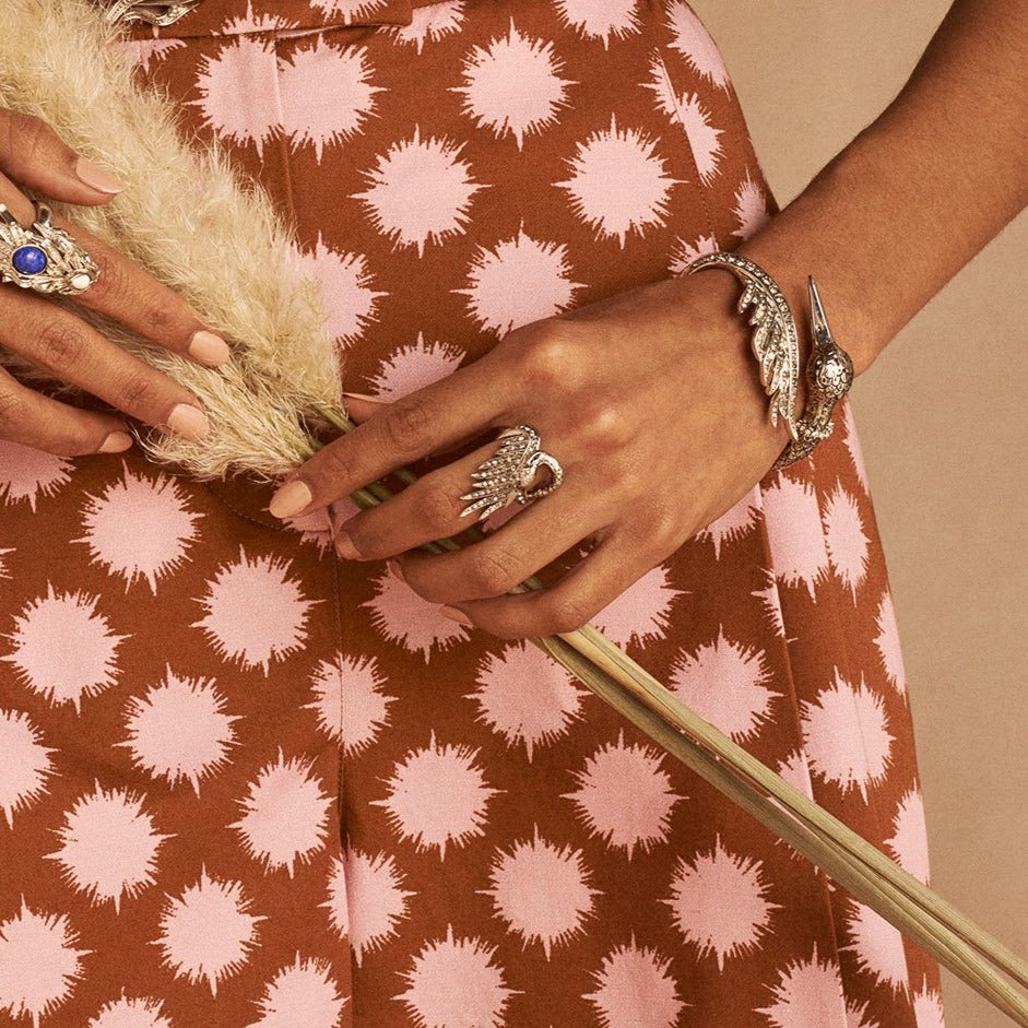 This Swan Bracelet by Sonia Petroff is a symbol of grace and beauty, designed in the form of a swan. Its minimalist aesthetic and hinged closure make it a versatile piece, perfect for stacking or wearing as a standalone statement of elegance.