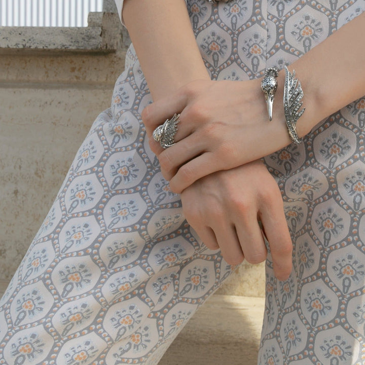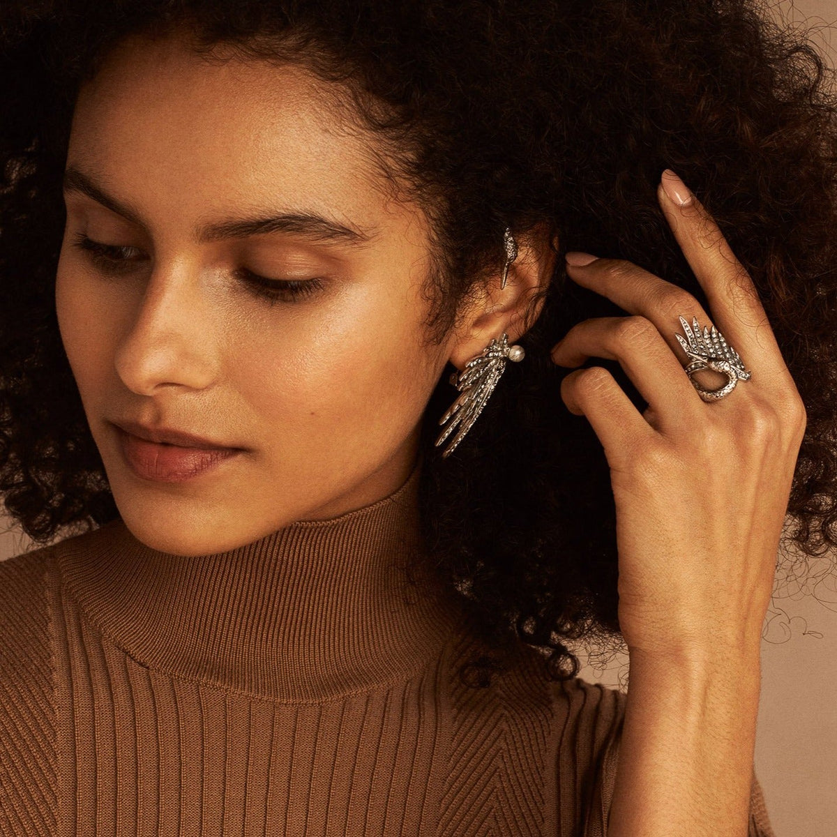 This Swan Ring by Sonia Petroff radiates luminous charm, capturing light with its silver palladium overlay and Swarovski crystal accents. The fume’ detailing adds a contemporary touch to this timeless design, perfect for any occasion.