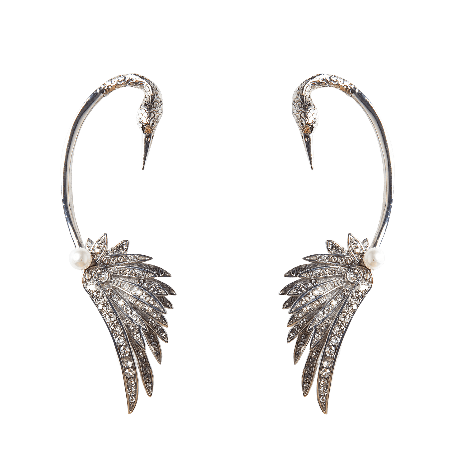 These Swan Earrings by Sonia Petroff balance vintage elegance with a modern twist. Featuring simulated pearls and Swarovski diamonds, they are designed as climbers for a bold yet refined look. Available as a pair or individually, they elevate any ensemble with their statement-making allure.