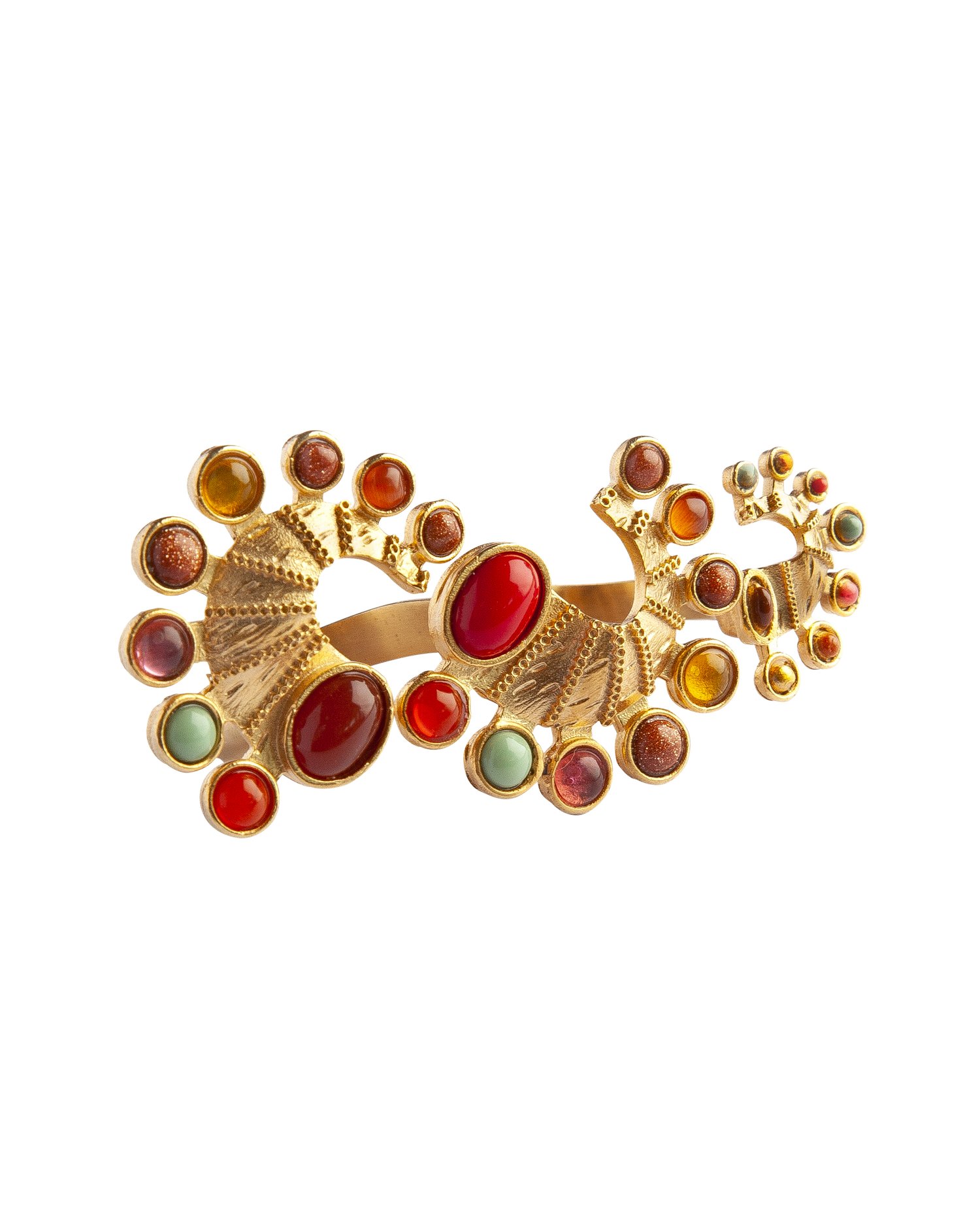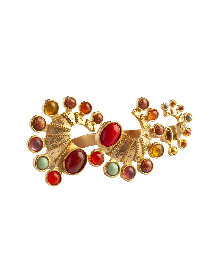 Crafted in brass with a 24-carat gold overlay. Features three hand-enameled spheres in varying sizes and colors, designed for a double-finger fit with a smooth, polished finish.