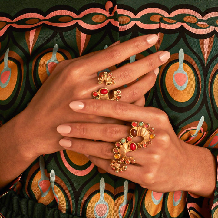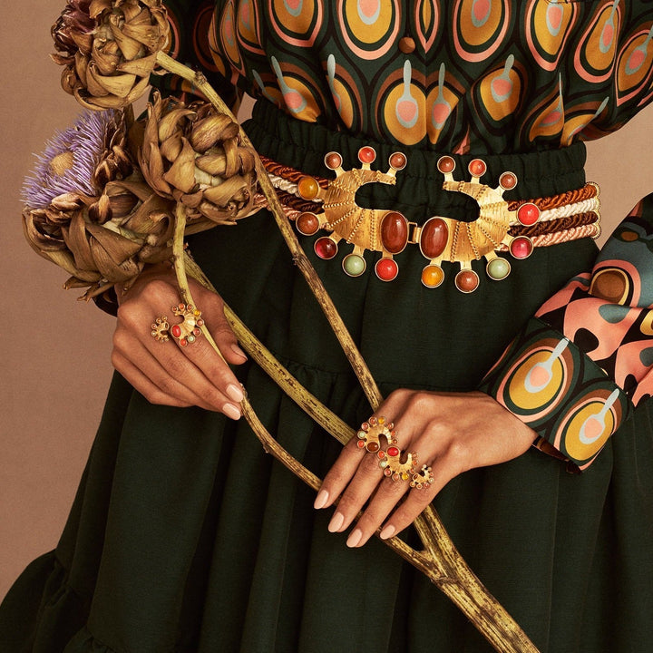 Entrusted with iconic designer Sonia Petroff's archive upon her passing, Maria Leoni-Sceti felt compelled to revive the vibrant and opulent pieces. Sonia's legacy, rooted in confidence and rebellion, finds new life through Maria's modern touch. The jewelry embodies a confident, feminine style, updated with a contemporary edge while retaining the vibrancy and joy of earlier times. Handmade in Tuscany, the brand prioritizes ethical production and sustainability.