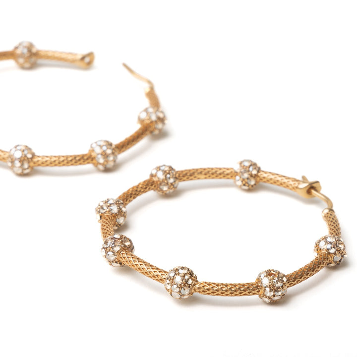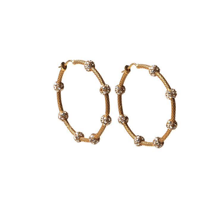 Made of brass with a 24-carat gold overlay. Embellished with Swarovski crystals that reflect light beautifully. Lightweight hoop design with textured detailing.