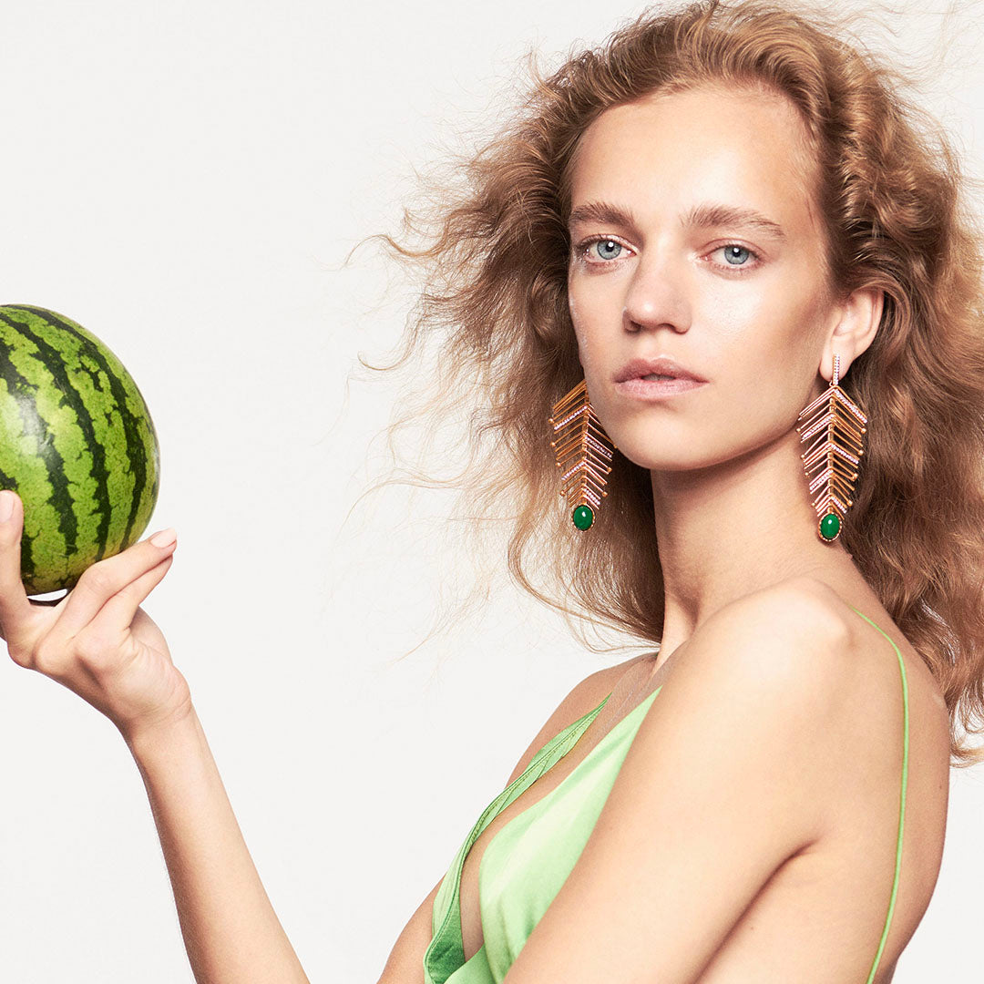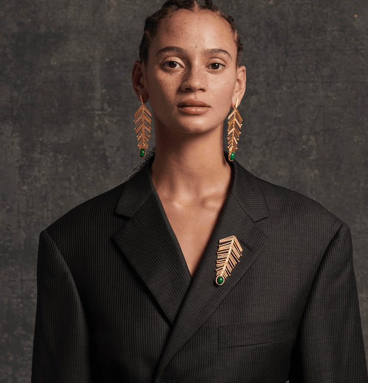 These Shela Earrings by Sonia Petroff pay homage to the vibrant life of Lamu Island, Kenya. Inspired by the abundant fish and the traditional seafaring heritage, the fishbone-shaped design is an elegant nod to sustenance and life. Crystal Swarovski diamonds and a striking emerald quartz stone add a refined touch to this unique piece, perfect for pairing with the matching brooch.