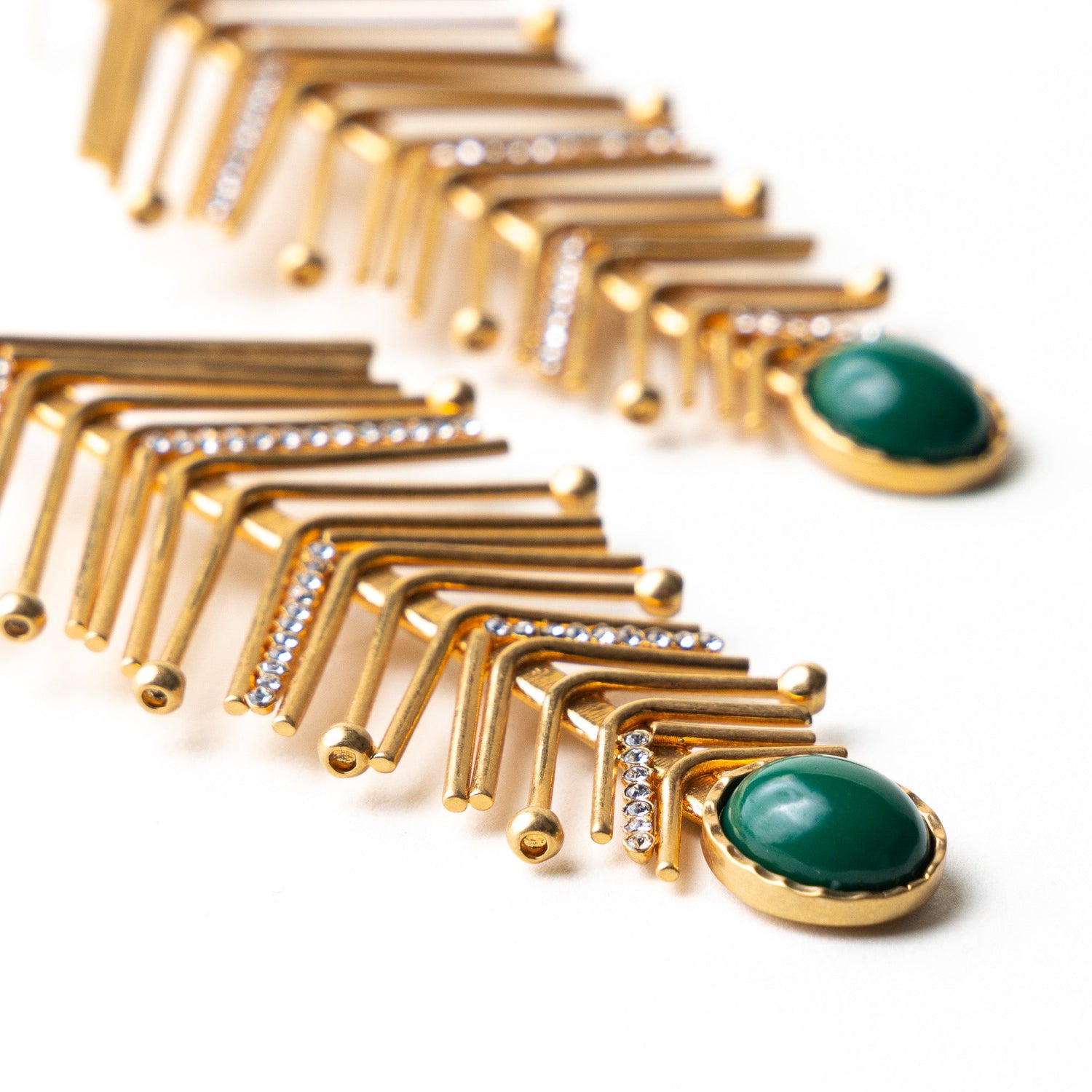 Crafted in brass with a 24-carat gold overlay. Features alternating lines of Swarovski crystal diamonds and a central emerald quartz stone. Dangling design with a lightweight yet striking profile.