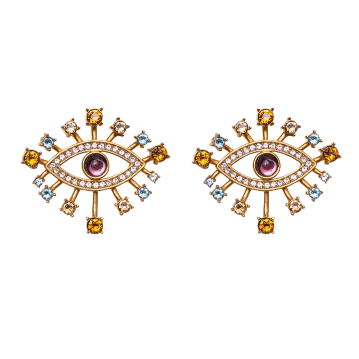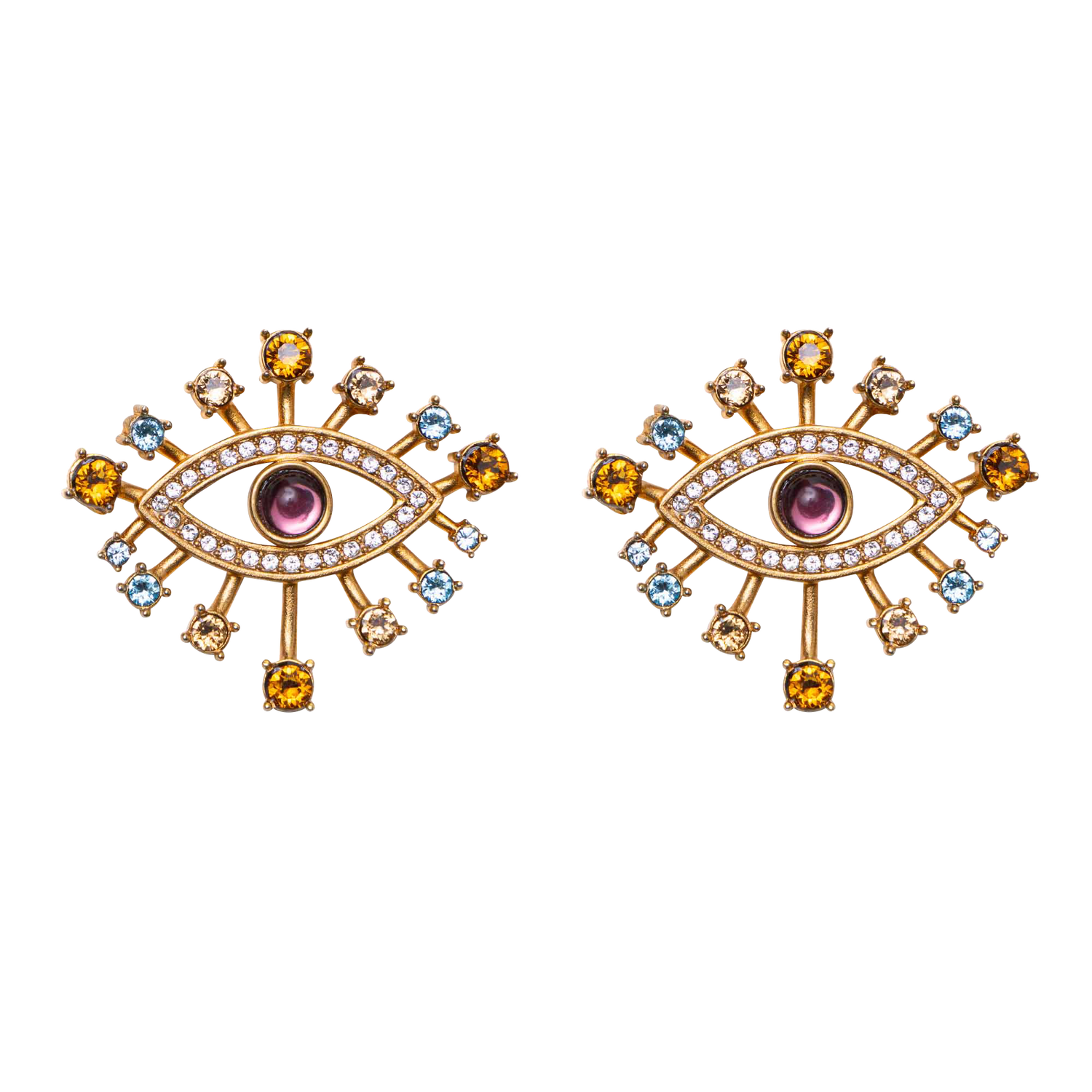 These Eye Earrings by Sonia Petroff celebrate the Mediterranean's deep-rooted traditions with the iconic evil eye motif. Designed as studs, they combine jewel-toned accents with sparkling Swarovski stones for a refined yet meaningful look. Perfect for adding subtle elegance and protective energy to your ensemble.