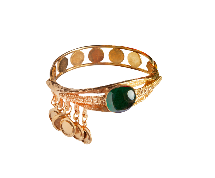 Handcrafted in brass with a 24-carat gold overlay. Bezel-set with a simulated green emerald cabochon. Hinged cuff design with hand-etched details and dangling gold discs.