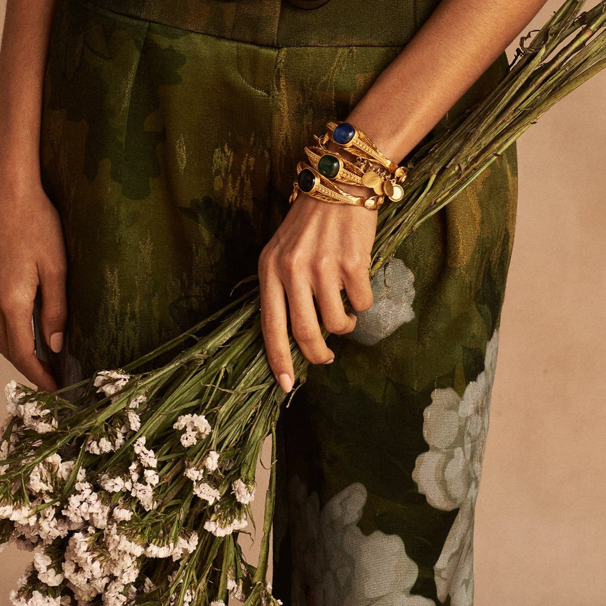 This Classic Eye Bracelet by Sonia Petroff (Green), twice featured in British Vogue, reimagines vintage style with modern sophistication. The simulated green emerald cabochon is bezel-set within a tapering mount, while dangling gold discs add a boho-chic vibe. Perfect for layering or making a solo statement.