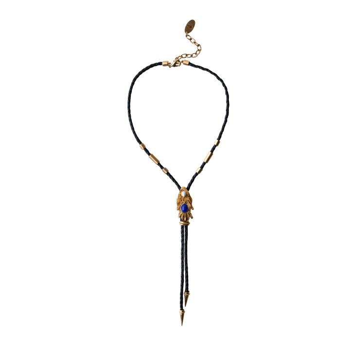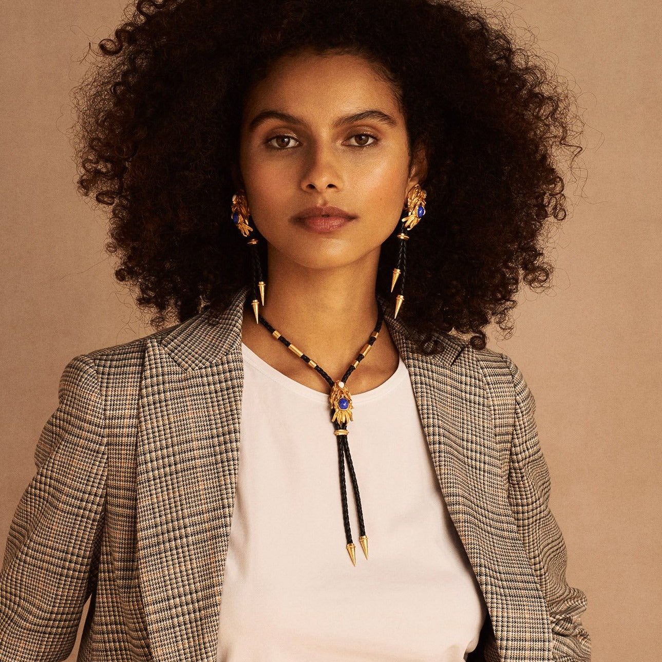 This Dragonfish Necklace by Sonia Petroff blends elegance with symbolism, inspired by Western bolo ties and the strength of the dragonfish. The Rococo-style dragonfish pendant is crafted with simulated white agate and lapis lazuli cabochons, paired with a braided leather cord. Whether styled with a t-shirt or a silk blouse, this lariat is a chic statement piece.