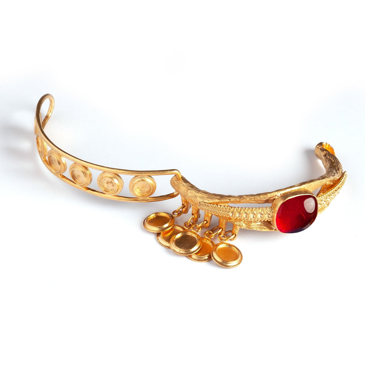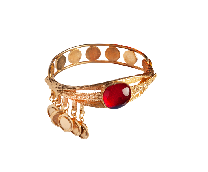 Brass with a 24-carat gold overlay. Bezel-set simulated ruby cabochon. Hinged cuff design with hand-etched details and dangling gold discs.