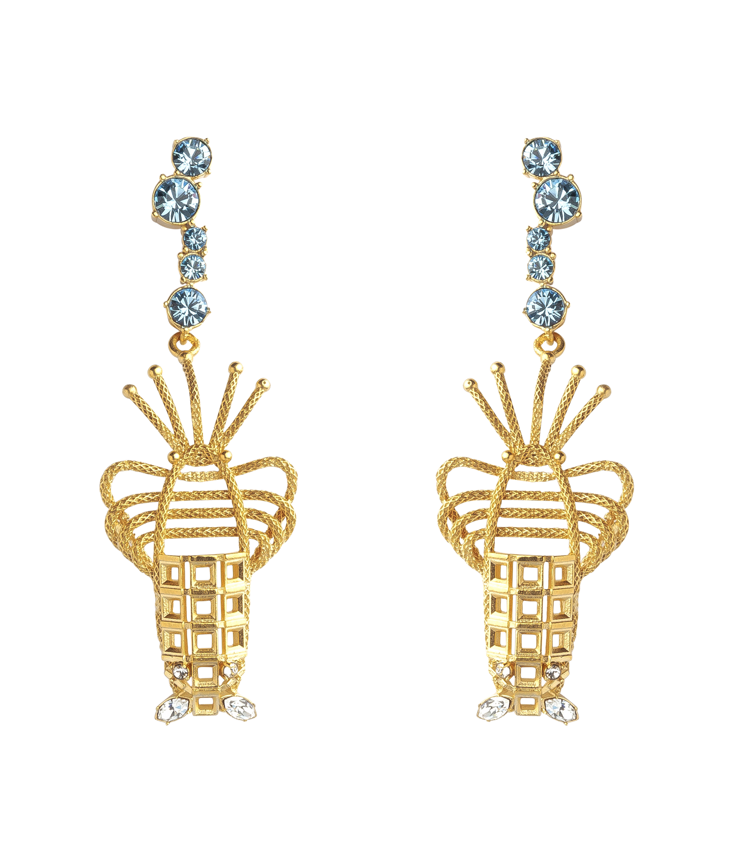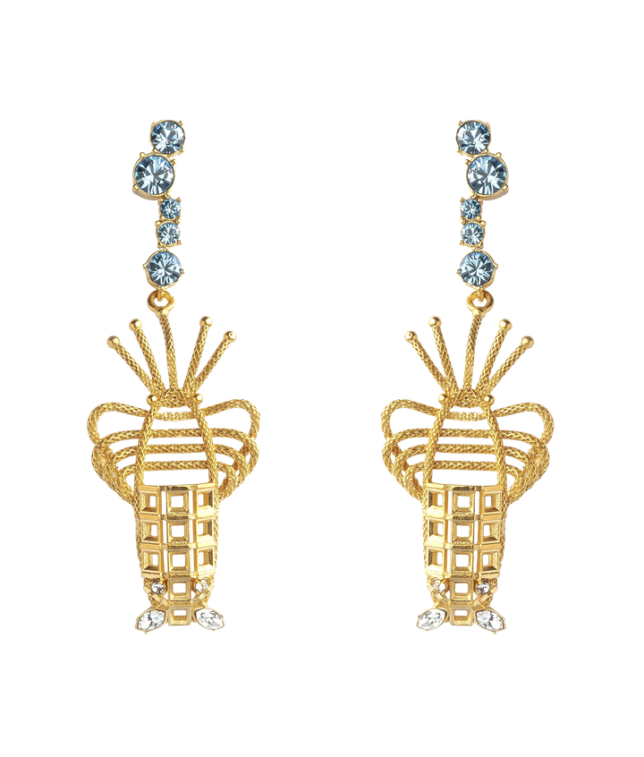These Lobster Pierced Earrings by Sonia Petroff (Blue) bring a playful elegance to her signature collection, inspired by the lobster's symbolic protection and regeneration. Simulated light blue aquamarines, representing air bubbles, pair with Swarovski diamonds to add sparkle and depth. These earrings make a bold yet refined statement.