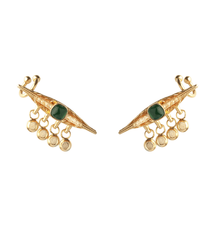 Crafted in brass with a 24-carat gold overlay. Bezel-set with a simulated emerald green cabochon. Lightweight stud design for a comfortable and secure fit.