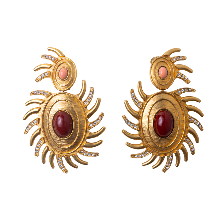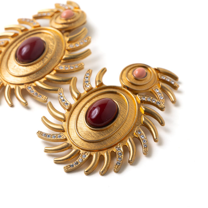 These Sun Earrings by Sonia Petroff (Red/Pink) radiate vintage-inspired elegance with their double sun motif, symbolizing warmth and vitality. Simulated carnelian and coral cabochons form the centerpiece, surrounded by sun rays adorned with Swarovski diamonds. A textured gold overlay adds a refined, vintage aesthetic.
