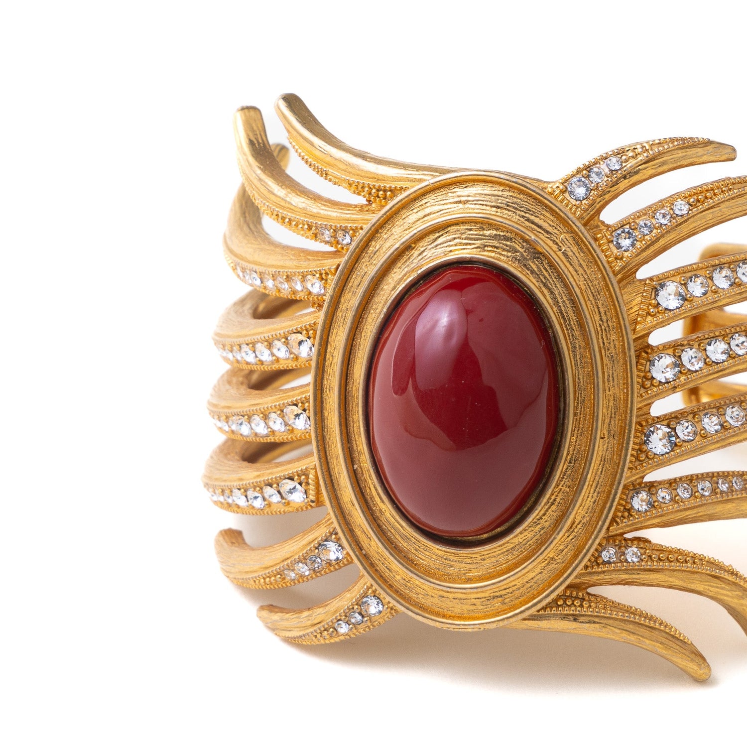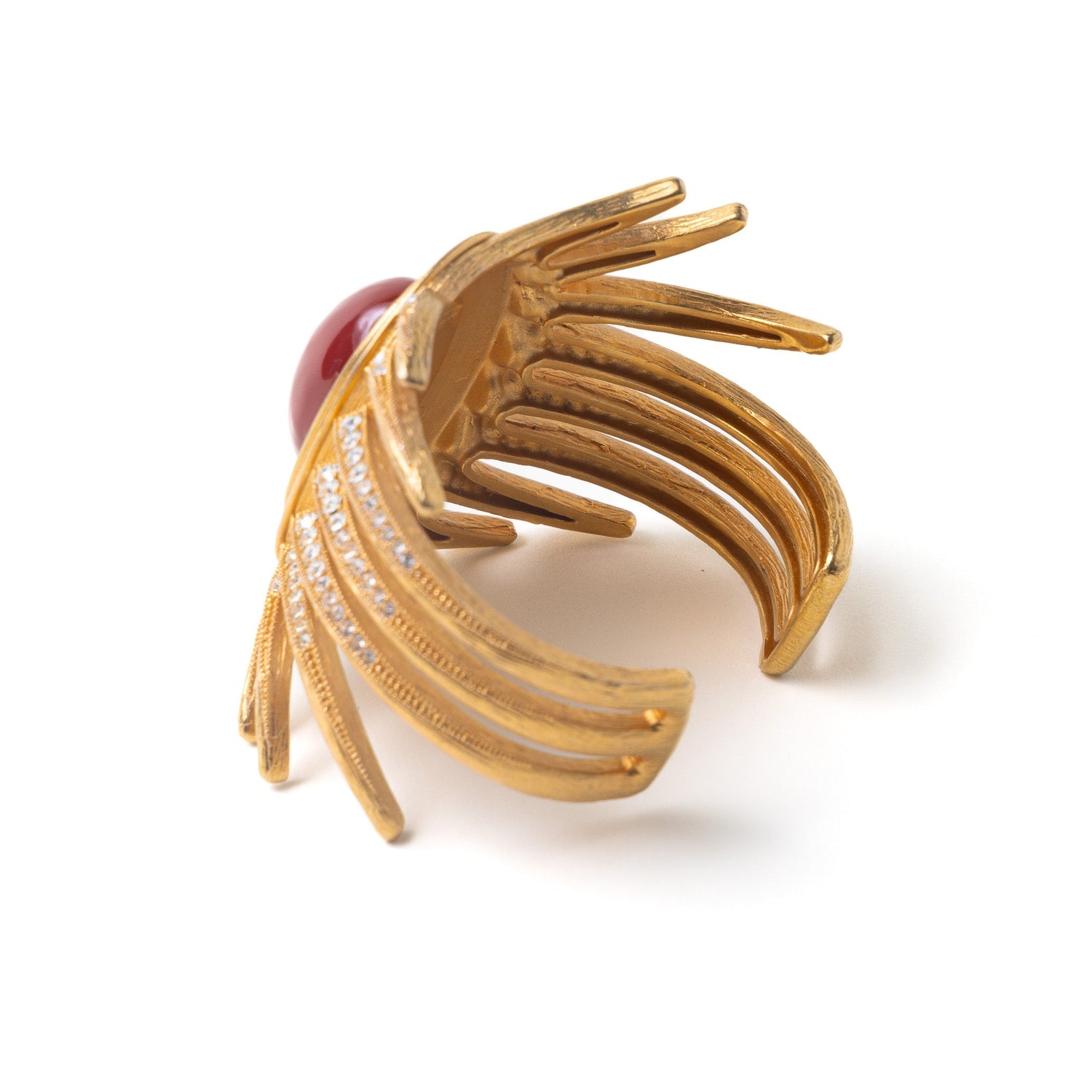Handcrafted in brass with a 24-carat gold overlay. Features a large simulated carnelian cabochon and Swarovski diamonds. Scalloped bezel setting and cuff design ensure a secure, adjustable fit.