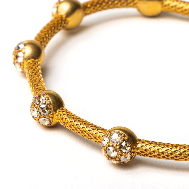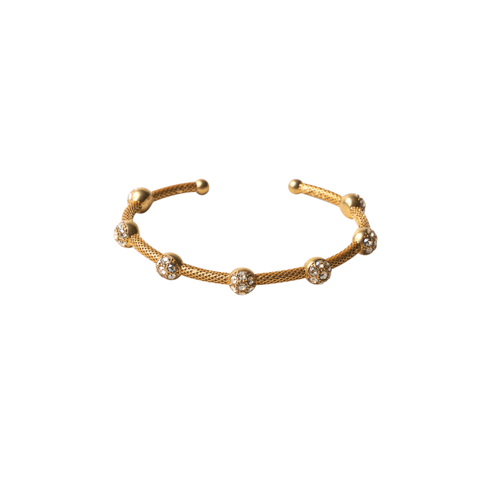 Made from brass with a 24-carat gold overlay. Adorned with Swarovski crystals for added sparkle. Textured finish and open cuff design for comfort and versatility.