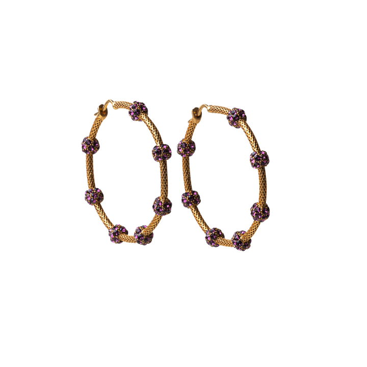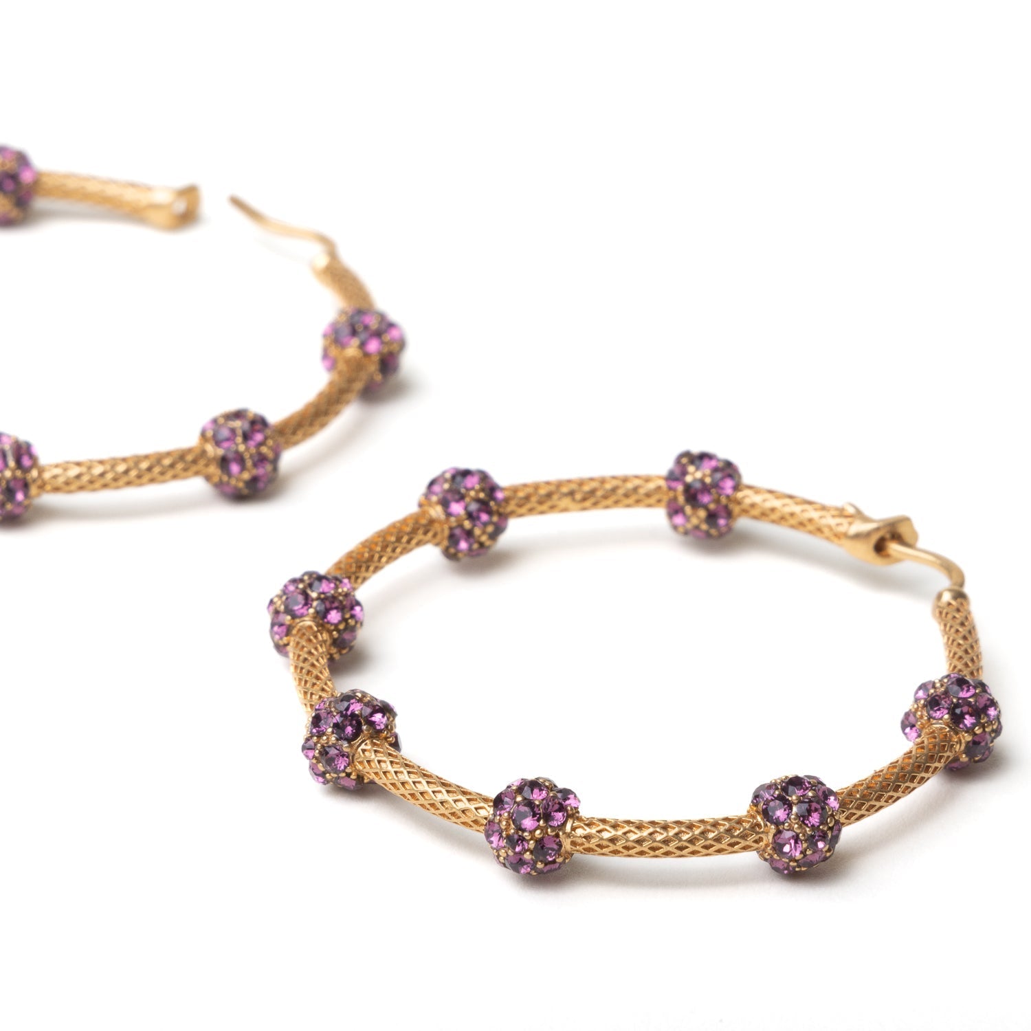 Made of brass with a 24-carat gold overlay. Accented with Swarovski crystals in red tones. Lightweight hoop design ensures comfort and wearability.