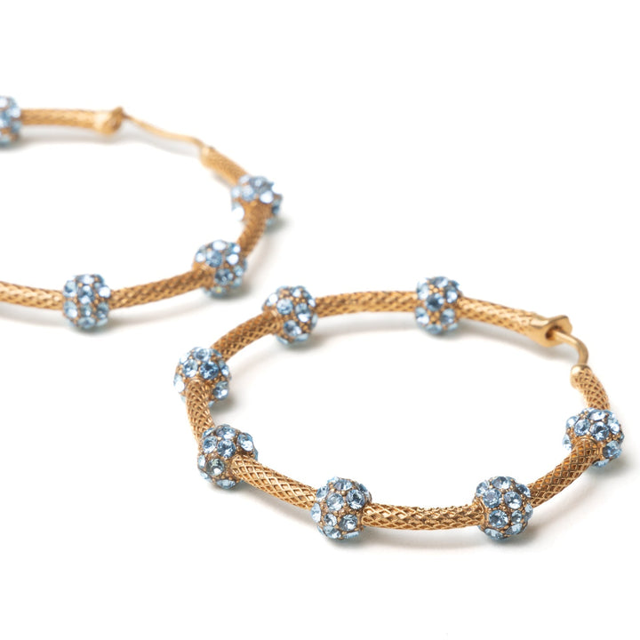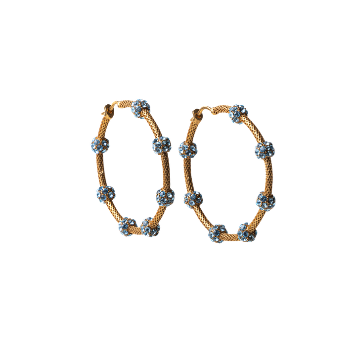 Crafted in brass with a 24-carat gold overlay. Embellished with Swarovski crystals in oceanic blue tones. Lightweight hoop design ensures comfort and effortless style.