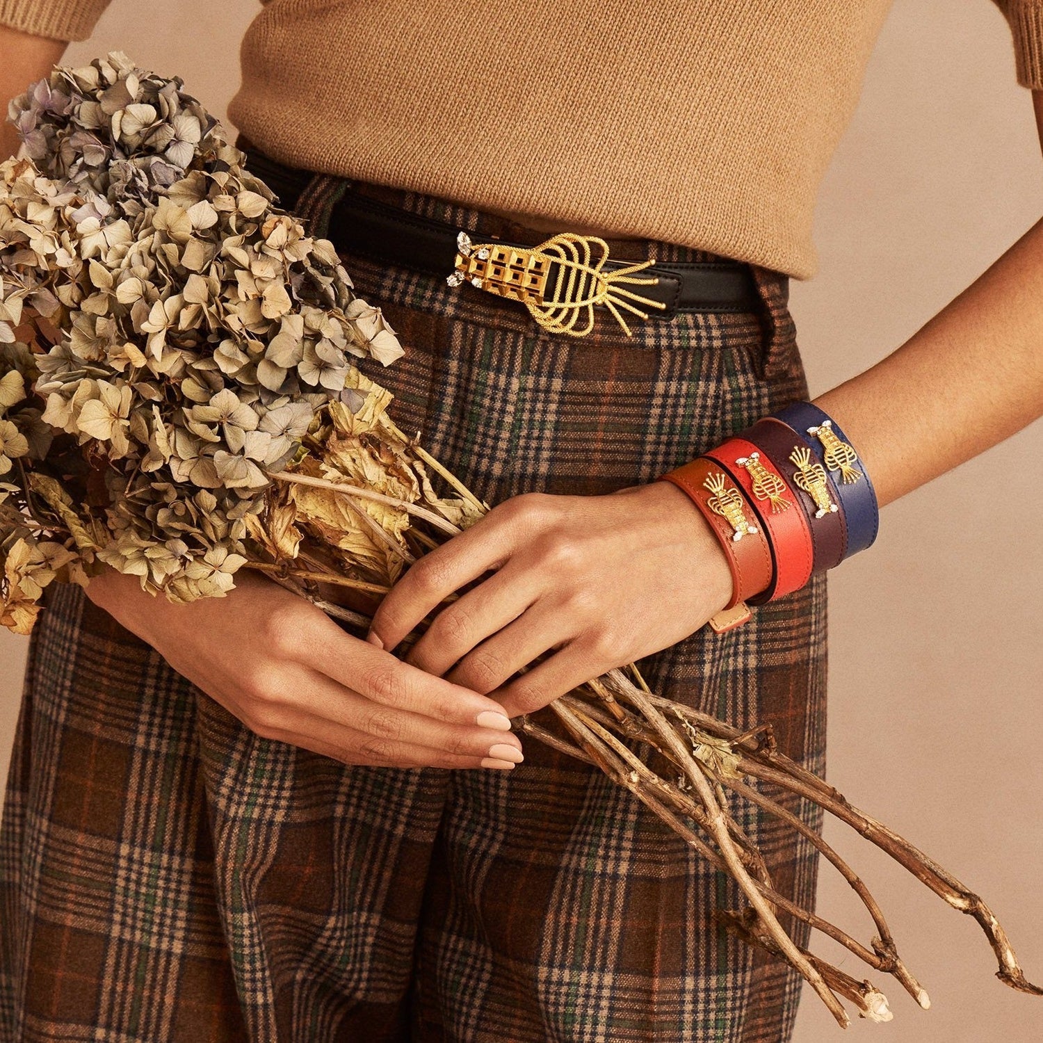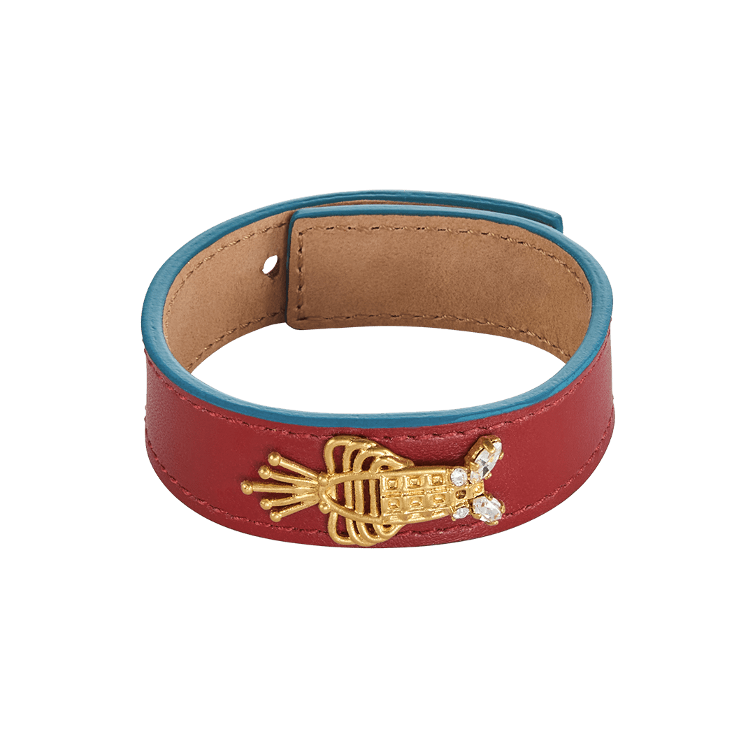 This Lobster Leather Bracelet by Sonia Petroff (Red/Blue/Gold) adds a playful pop of color to your casual wardrobe. Featuring Sonia's signature lobster motif, symbolizing regeneration and protection, the bracelet combines vibrant leather with luxurious gold details. Adjustable for a perfect fit, it’s a chic accessory for creative women.