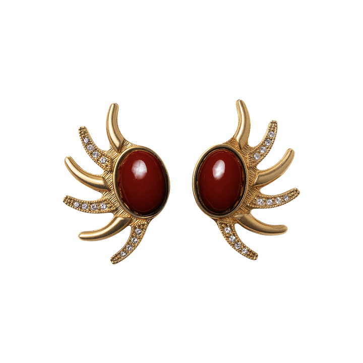 These Sun Half Earrings by Sonia Petroff draw inspiration from vintage sun designs, featuring vibrant simulated cabochon stones at their center. Sun rays fan out, embellished with round-cut Swarovski diamonds. A luxurious 24k gold overlay finish and clip-back closures ensure these handcrafted earrings are as practical as they are beautiful.