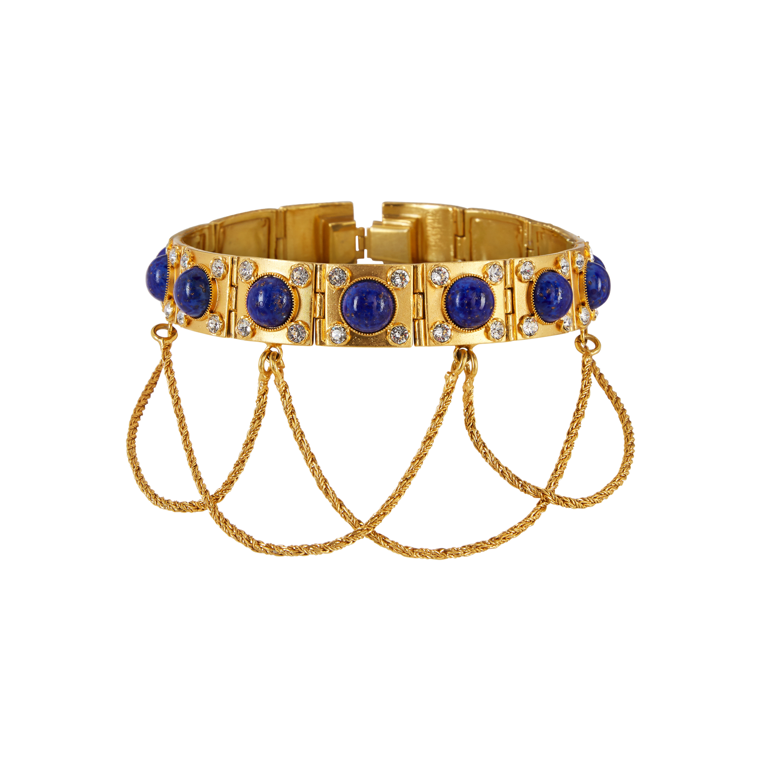 Crafted in brass with a 24-carat gold overlay. Features lapis lazuli-colored stones and mosaic tile details. Draping golden chains add dimension and elegance.
