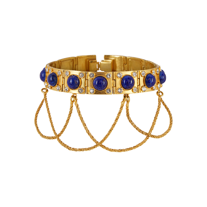 This Liana Choker by Sonia Petroff draws inspiration from Byzantine aesthetics and Mediterranean art. Featuring lapis lazuli-colored stones encased in gold mosaic tiles and draping golden chains, this choker is a captivating homage to Sonia’s love of heritage and travel.