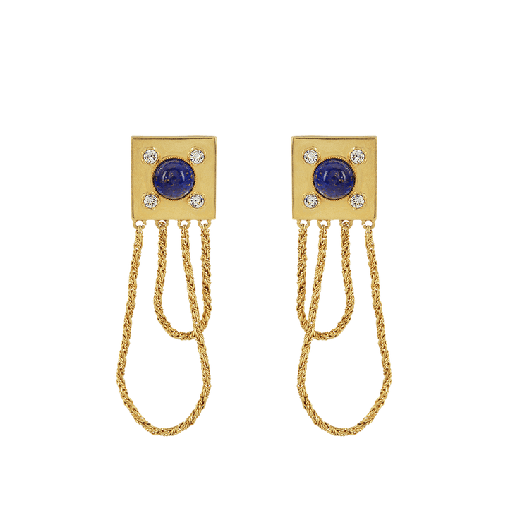 These Liana Drop Earrings by Sonia Petroff are a sophisticated nod to Byzantine aesthetics, featuring lapis lazuli-colored stones in gold mosaic tiles and draping golden chains. A beautiful blend of heritage and statement style, they reflect Sonia’s Mediterranean inspirations.
