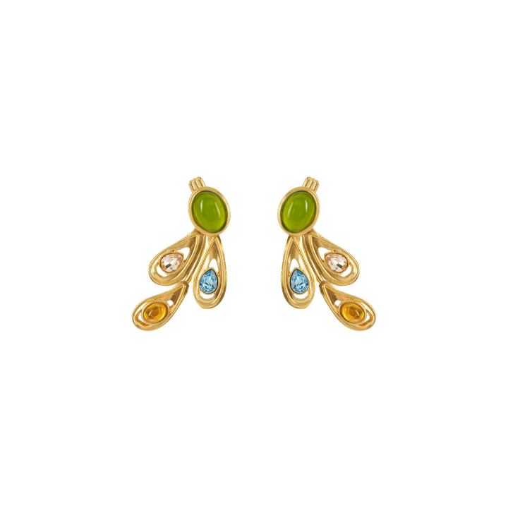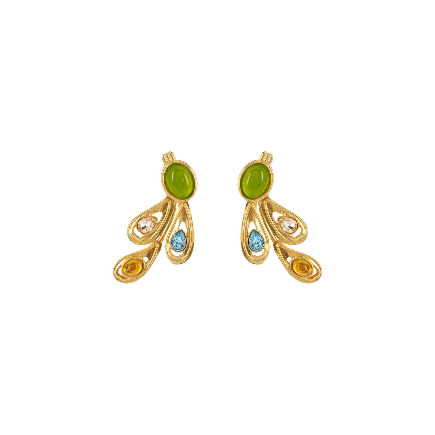 Made of brass with a 24-carat gold overlay. Embellished with colorful stones in a feather motif. Lightweight stud design for versatile styling.