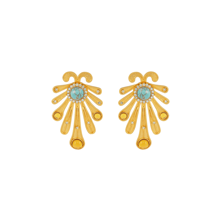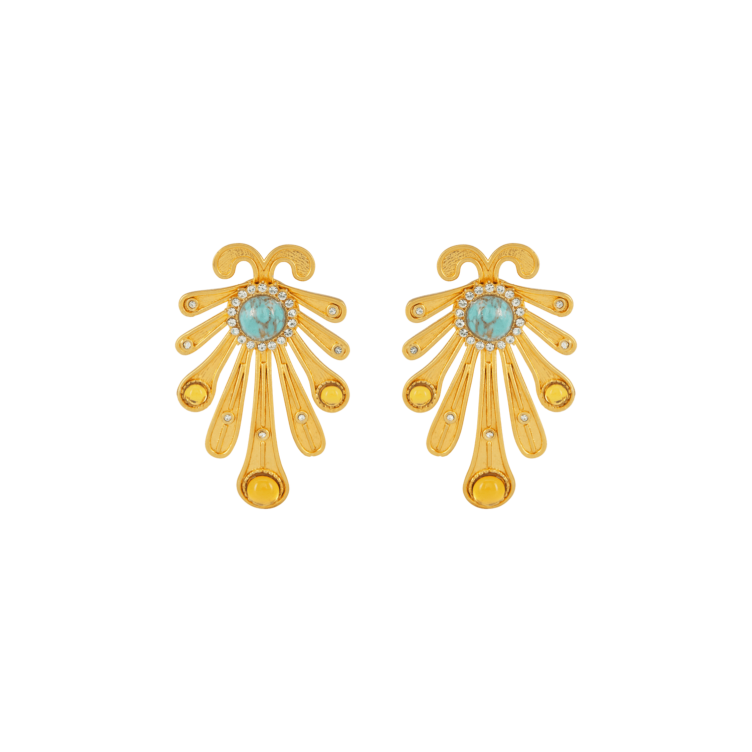 Crafted in brass with a 24-carat gold overlay. Features simulated turquoise cabochons, colored resin cabochons, and Swarovski rhinestones. Lightweight stud design for comfortable wear.